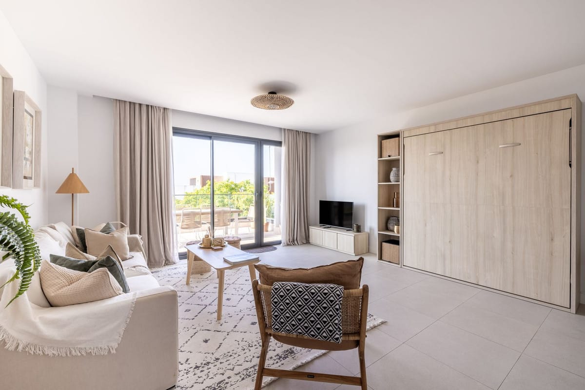 The property features a separate kitchen, a living room, and a bedroom with built-in wardrobes offering ample storage. From the living room, you have access to one of the apartment’s two terraces, with space for a dining table and chairs — ideal for outdoor meals or relaxing.