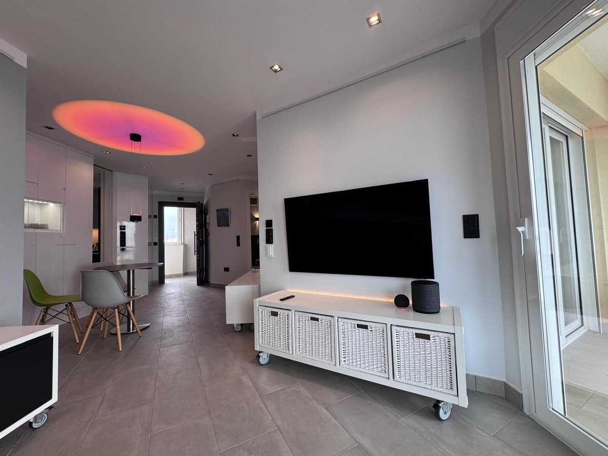 The apartment is well designed and includes air conditioning in both the living room and the bedroom, built-in wardrobes, and large sliding doors that provide direct access to the terrace from both spaces.