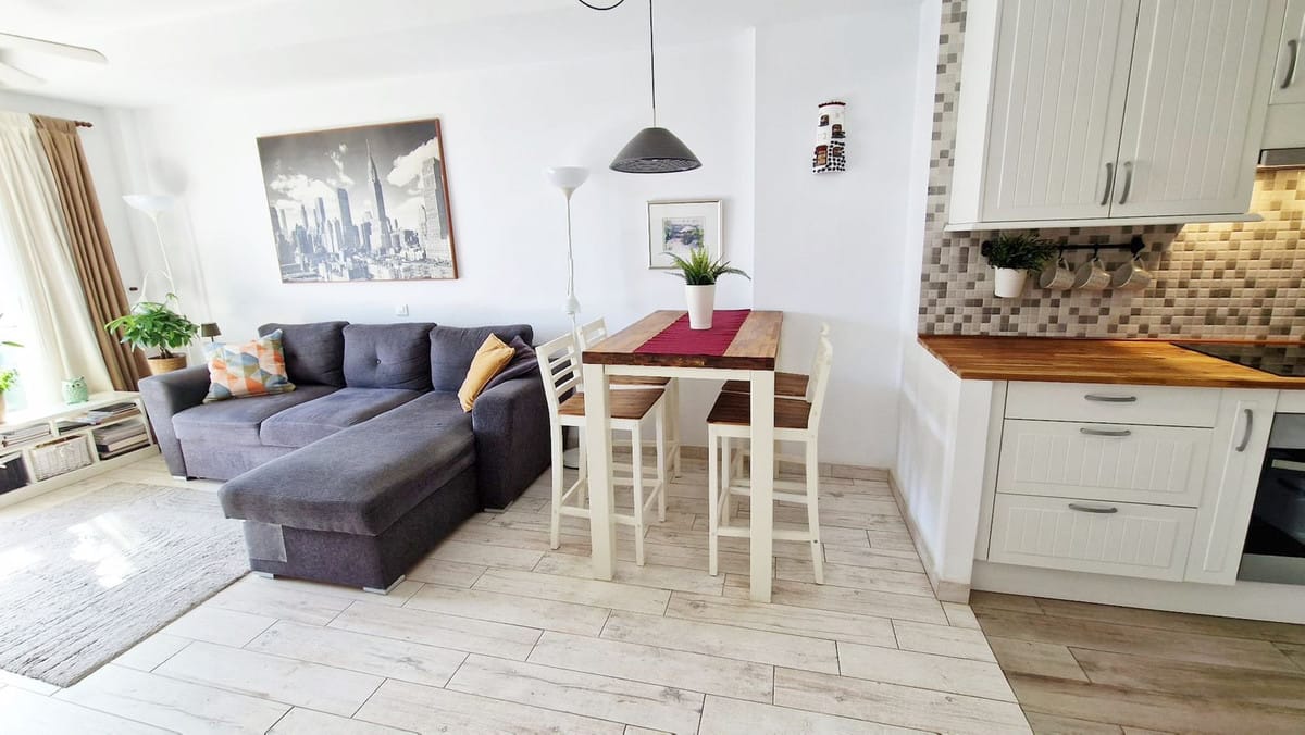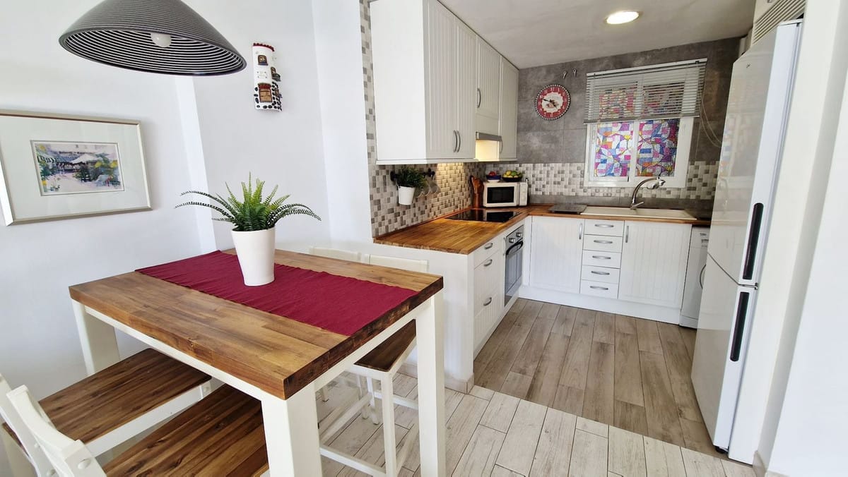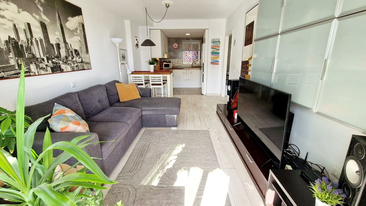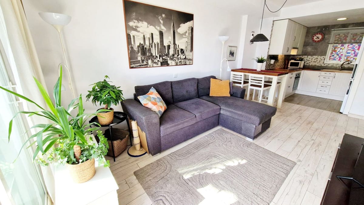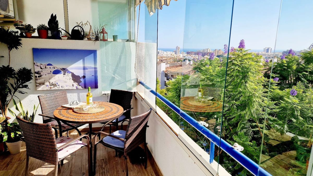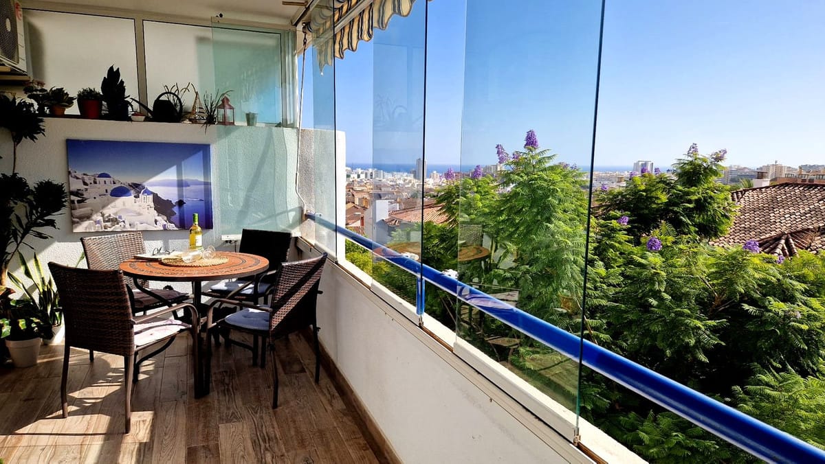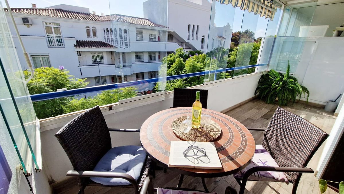 Reformed first floor one bed apartment west facing with large covered terrace overlooking communal gardens in central los Pacos with modern shower and open plan living room with american style kitchen walking distance bars shops and public transport. air conditioned .