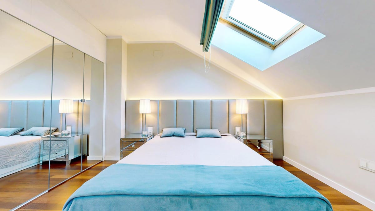 The elegant staircase leading to the upper floor connects directly to the living room, and we can go up to the attic bedroom with two windows at the top and a storage room, as well as a full bathroom with a shower. There is also a generous dressing room, and this room has split air conditioning and independent heating.