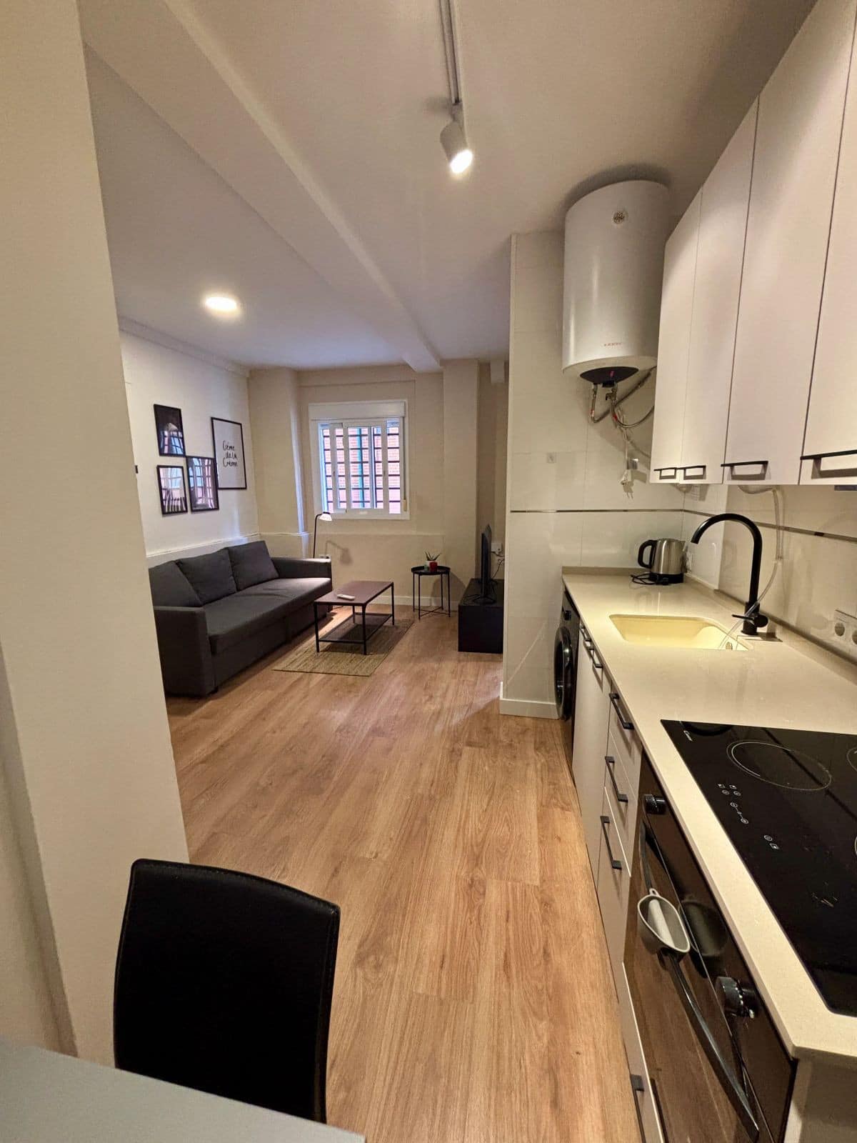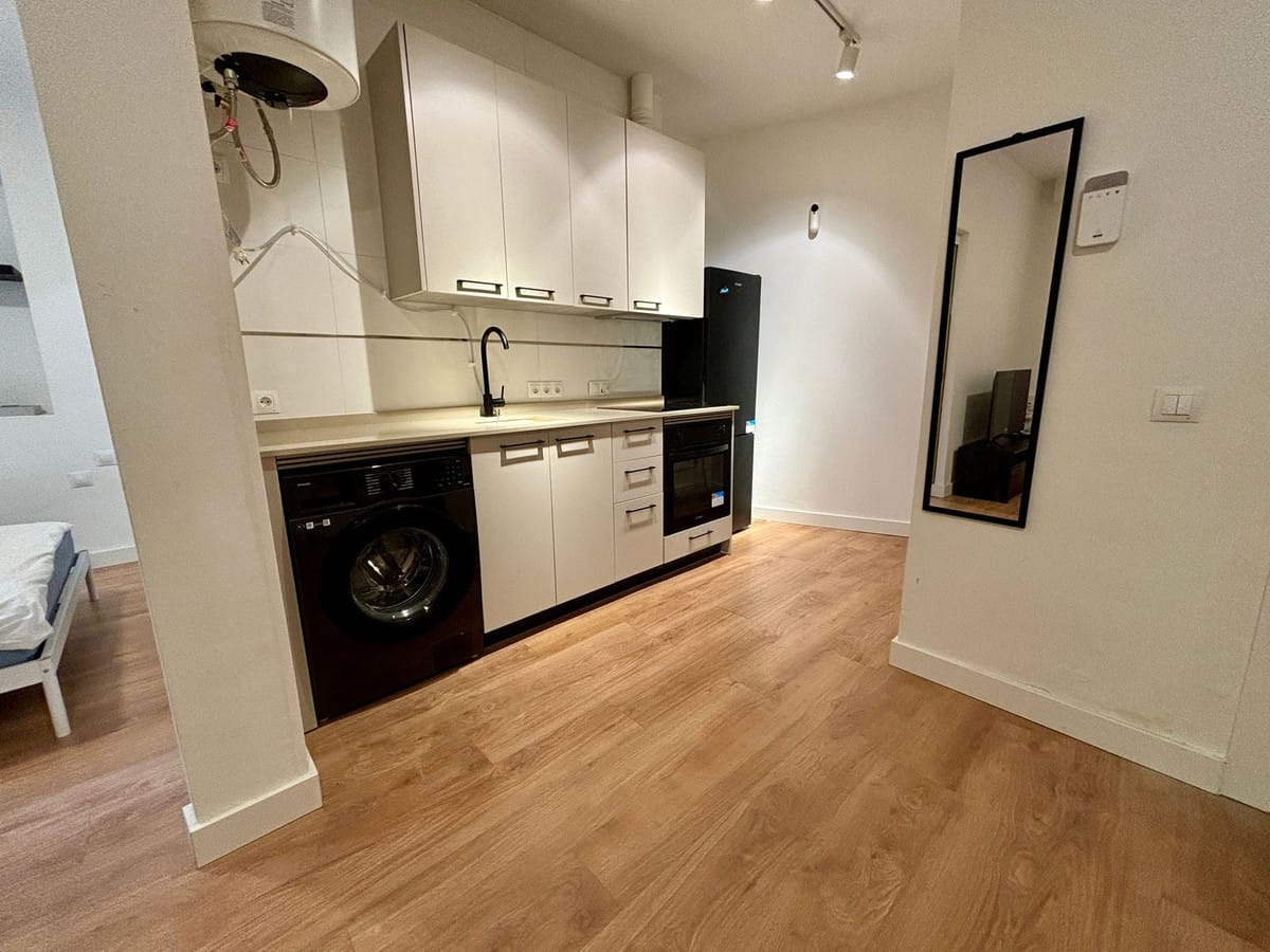 Located in a fully renovated 1880's building, the apartment has a built area of 44 m². Originally featuring one bedroom, it has now been converted into a loft-style layout with an integrated kitchen and living area, offering plenty of natural light through its large window.