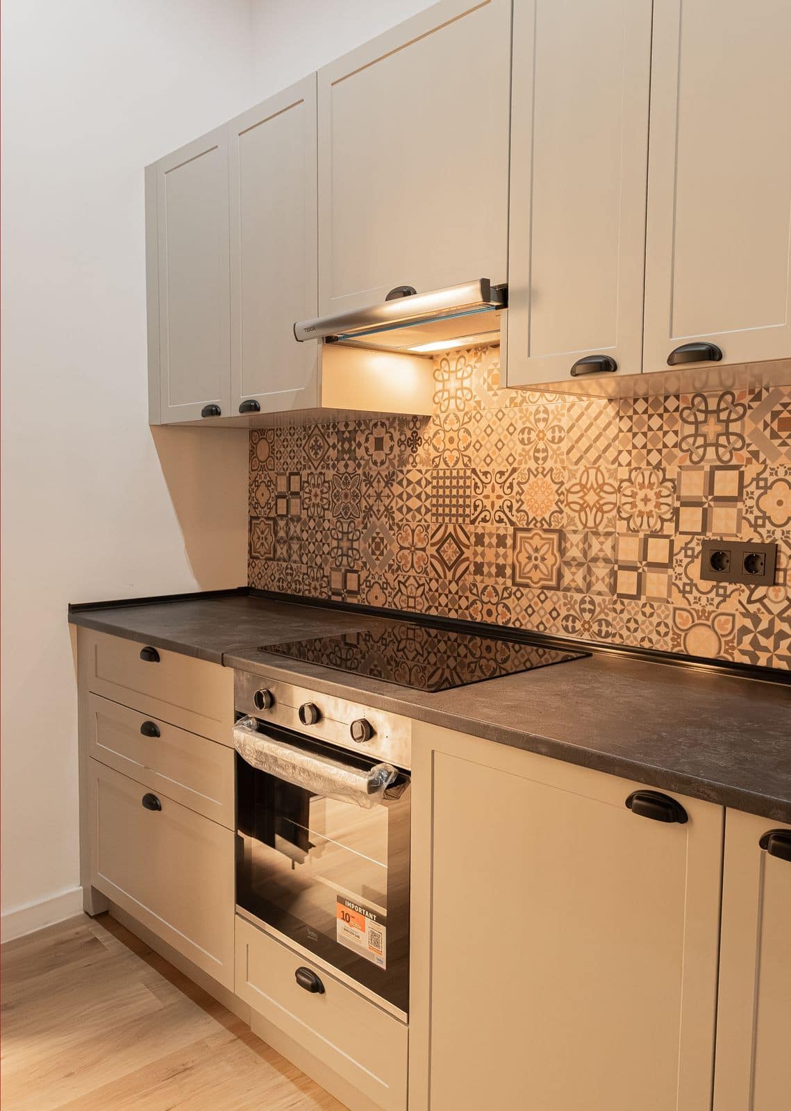 The brand-new kitchen has been custom-designed for this property and includes a range hood, ceramic hob, oven, washer-dryer, and built-in refrigerator — all brand new, unused, and included in the price. The living room and bedroom furniture are also new and unused.