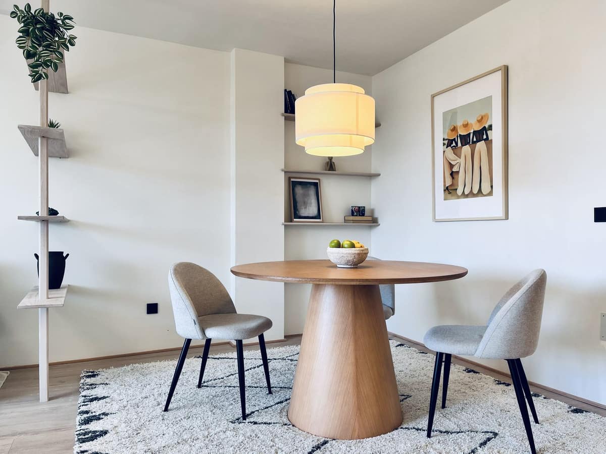 The entrance leads into a spacious and modern, open-plan kitchen and dining area. A custom-built natural oak room divider separates the lounge area, allowing light to flow through the entire living space without compromising the open feel.