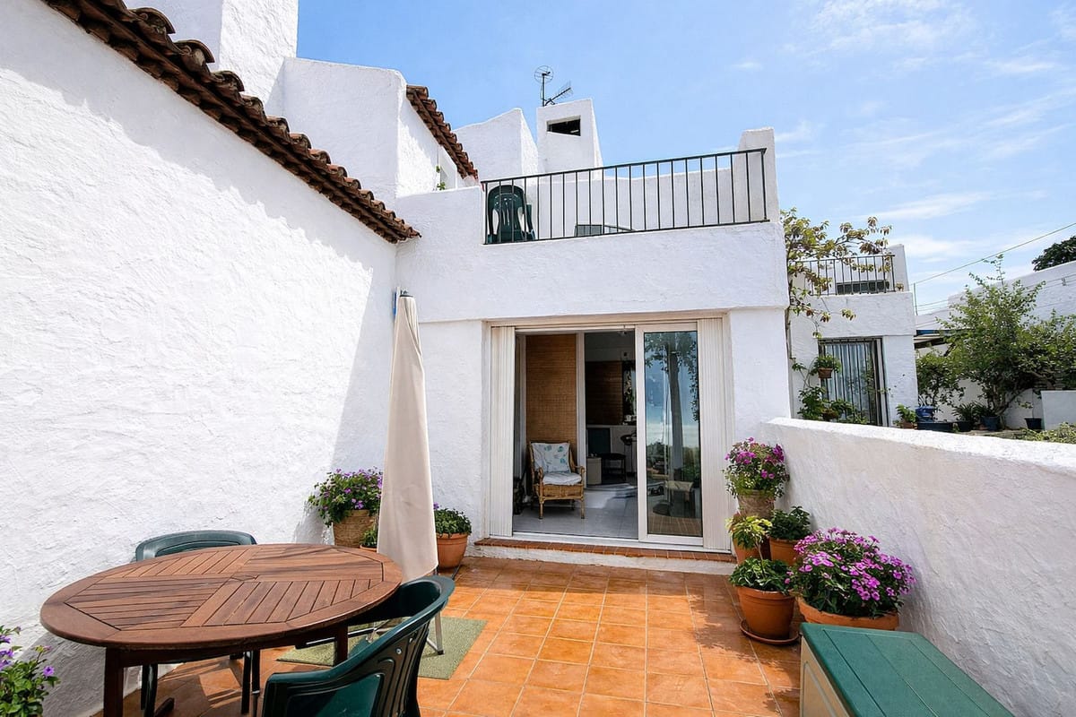 Location Bahía de Casares, one of the most coveted locations along Casares Costa. Designed by the renowned Aubrey David, this exclusive complex features low-rise Andalusian-style residences nestled among expansive, tranquil gardens, with a large communal pool at its heart. The beach at Torre de la Sal is just a leisurely stroll away, while the charming village of Sabinillas and the vibrant La Duquesa Marina are only five minutes by car. Estepona town centre is a ten-minute drive, offering shops, dining, and culture. Golf enthusiasts will enjoy easy access to top courses, including Doña Julia and the prestigious Finca Cortesín. The property benefits from excellent access to the main road, providing a straightforward commute to Marbella, as well as Gibraltar and Málaga airports, located around 30 minutes and one hour away respectively. Internal Layout Upon entering you notice that this property oozes the Mediterranean rustic charm and lifestyle. The ground floor is quite simply one room that opens to 3 or four with character inglenooks and crannies and sloping ceilings, that allows plenty of natural light and air. The living room has a high ceiling and dominated by a super copper chimney fireplace with a log burner. There is room to accommodate ample seating areas and a formal dining area. Here there are large patio doors that lead out to the garden terrace. The fitted kitchen is open plan with a breakfast bar area. The living room leads down to a snug area – ideal for an office area. This area opens out to the second garden terrace and lower garden. The ground floor is complemented with a downstairs guest cloakroom. A feature staircase leads to the upper level and landing with large storage cupboards. The Bedroom is a spacious double with plenty of character features. Here there is access to the en suite bathroom and third terrace. The property has had some updates over the years and in good condition, but some new updates would certainly enhance this character property. Outdoor Layout The villa benefits from an exceptional amount of outdoor space, perfectly embracing the essence of Mediterranean living. A choice of sunny terraces, a charming courtyard-style enclosed garden terrace, and a private garden area provide versatile spaces for both relaxation and entertaining. Each area is positioned to offer a choice of sun or shade throughout the day. The courtyard terrace, accessed directly from the living room, offers a private and intimate setting — ideal for al fresco dining or unwinding in a tranquil atmosphere. A second terrace, also accessed from the living room, enjoys an easterly orientation, capturing lovely sea views and the morning sunshine. This terrace flows seamlessly down to the private garden area, enhancing the indoor-outdoor lifestyle. The third terrace is accessed from the upstairs bedroom and is perfectly positioned to take full advantage of the super sea views. translate to spanish