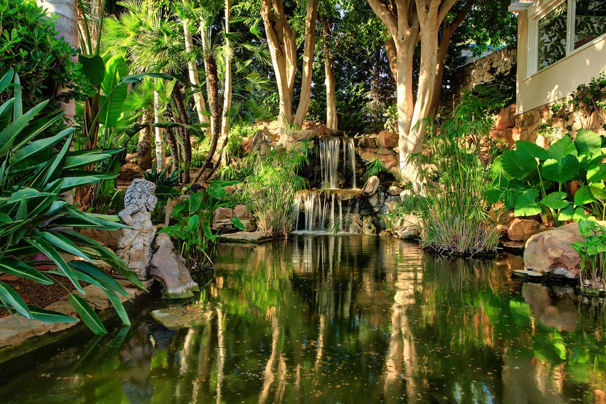The ground floor houses the main living and reception areas, with spacious lounges and a formal dining room arranged around a central patio with a fountain, which floods the interior spaces with light and freshness.