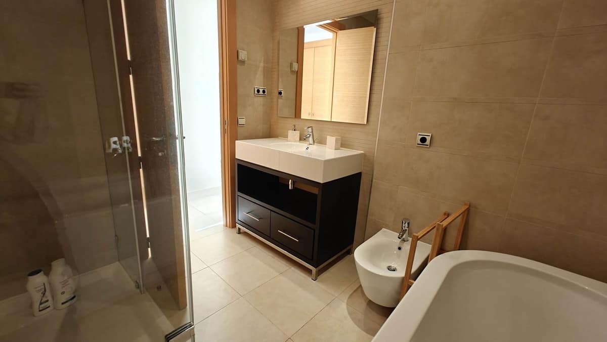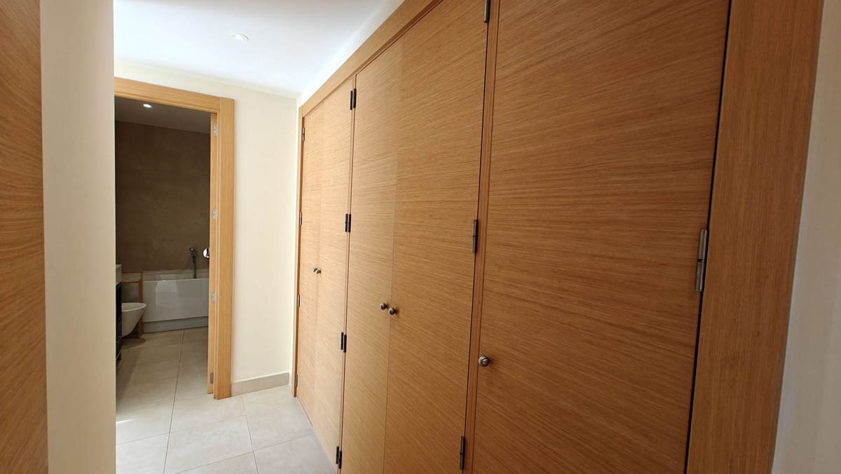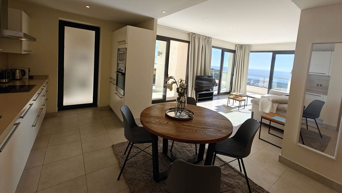 A semi-private elevator takes us to this fantastic penthouse. On the first level, we find a bright and spacious open-plan living area, with raised ceilings that give this particular apartment a feeling of openness as you walk in. This duplex has beautiful Porcelanosa flooring throughout, and a well-equipped kitchen that features a gorgeous quartzite countertop island, perfect for entertaining or enjoying a relaxing brunch. A pretty view of the hills can be enjoyed from the window over the sink. All ceiling lights throughout the house are energy-efficient and dimmable, for an easy change in ambiance depending on the occasion.