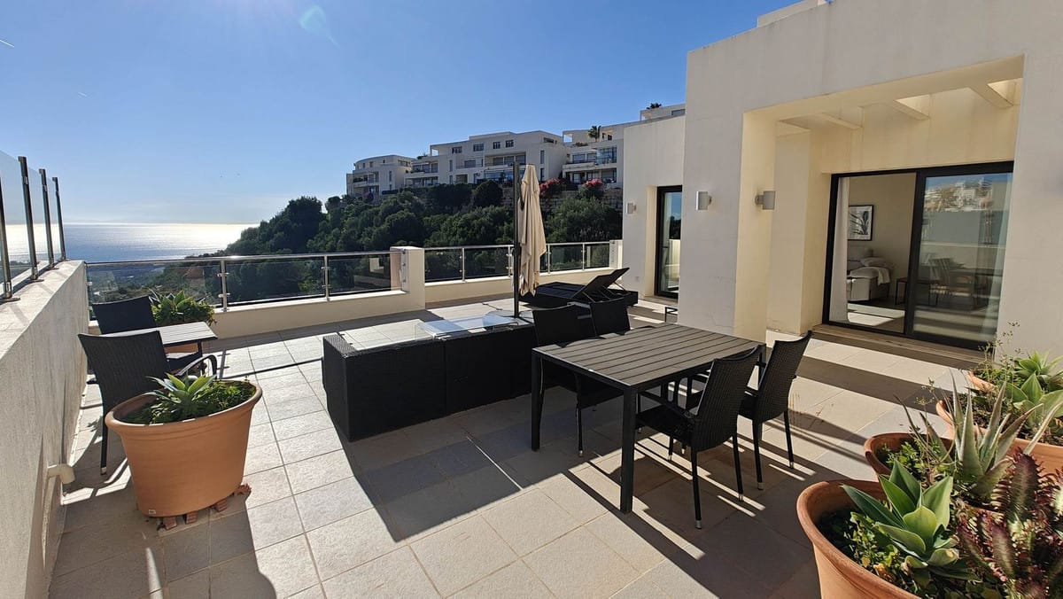 A sophisticated modern stairway with a large window (offering sea views) leads us upstairs to the master bedroom, a luxe and inviting space where one can enjoy spectacular views of the sea and coastline while lounging in bed. On a clear day, the outline of the African mountain range can be seen, along with Gibraltar and the nearby Sierra Blanca mountain range. The room comes with ample built-in closets. The ensuite bathroom is done in black slabs with white veining, which, juxtaposed with the white sink and cabinetry, makes it simply stunning!! On that same level, we find a large second terrace, ideal for sunbathing, as it is entirely private, where one can enjoy a snack at the high table and, undoubtedly, the incredible 360º views. It comes equipped with an outdoor shower, a nice addition for a quick refresh while enjoying the summer sun.