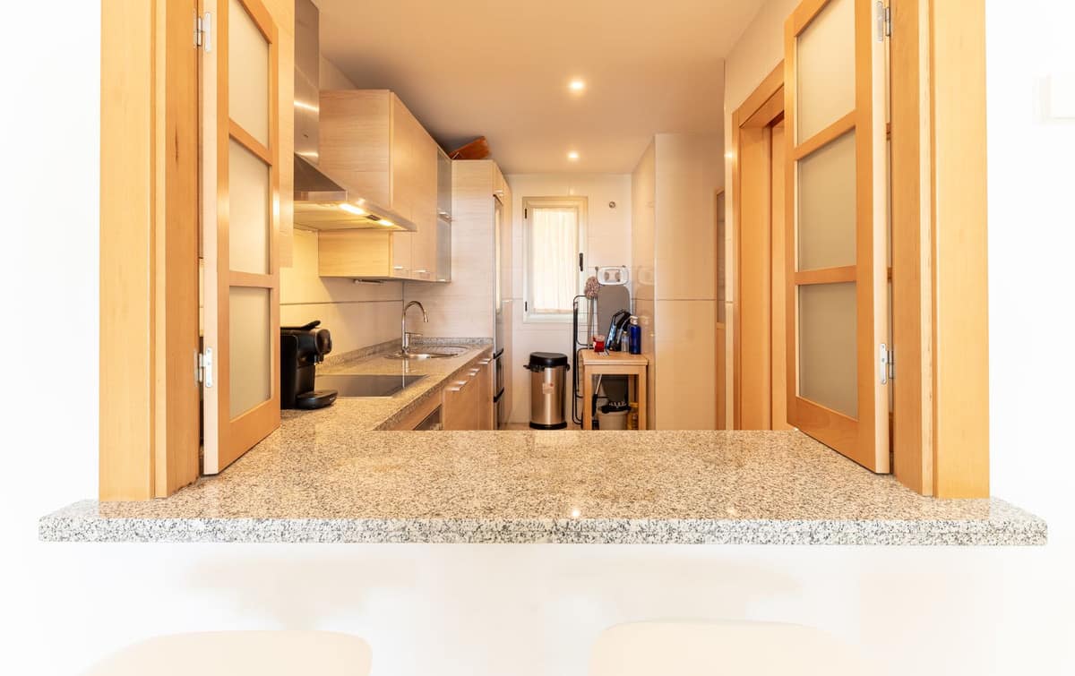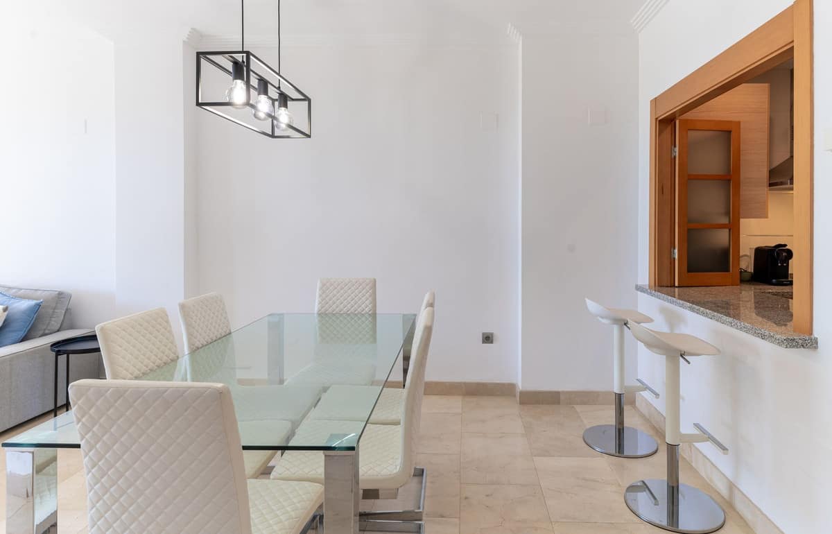 The apartment features a fully equipped, open plan modern kitchen, perfect for cooking enthusiasts, and a centralized air conditioning system ensuring comfort throughout the year. As you enter, you are welcomed by a spacious and bright living/dining area that connects to a covered terrace, an inviting space to relax or dine outdoors.