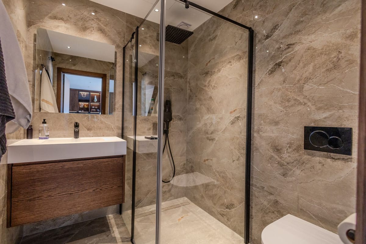The modern bathrooms include underfloor heating for added comfort, while the apartment also benefits from a rare 2-car garage and a large private storage room.