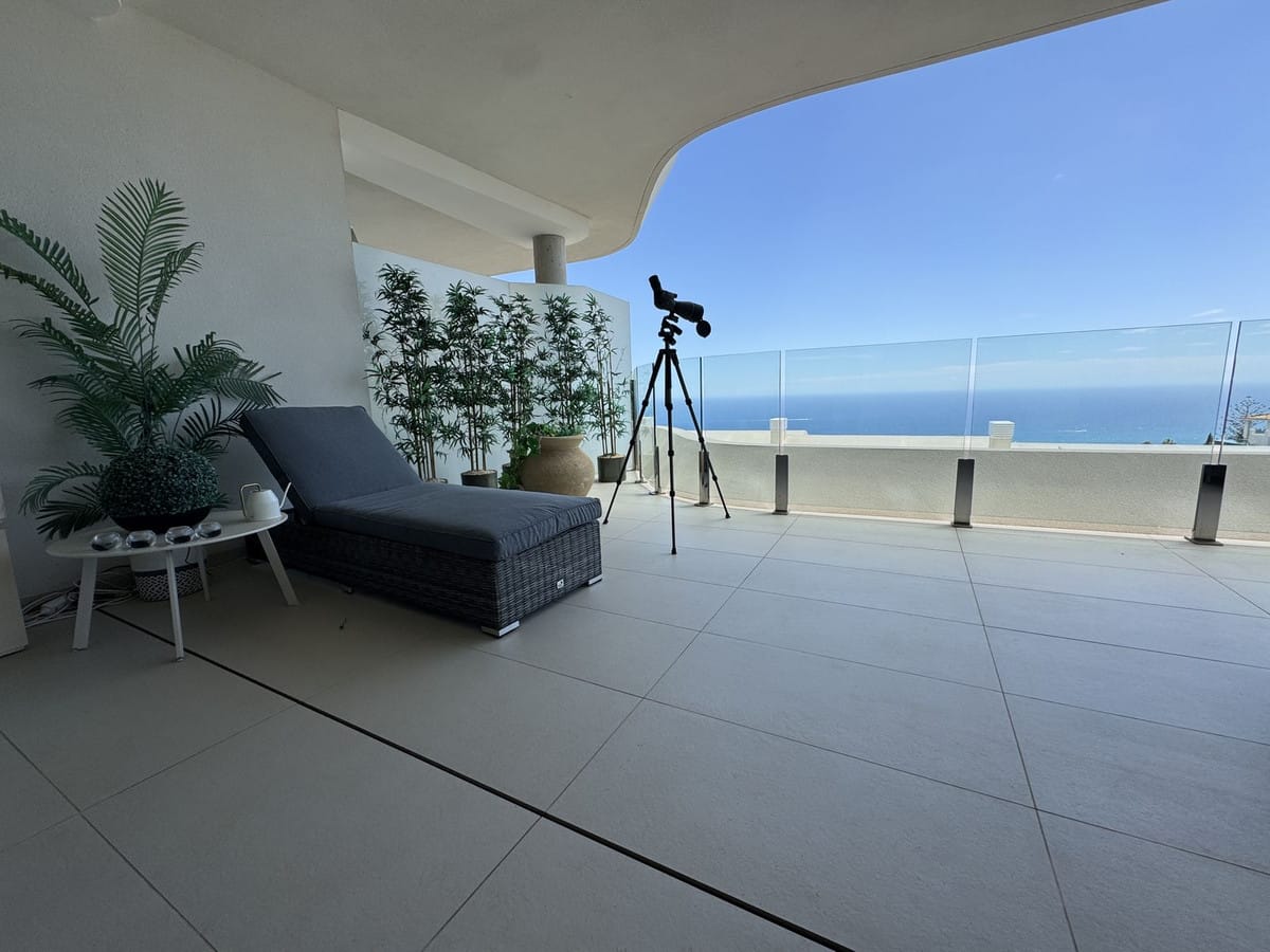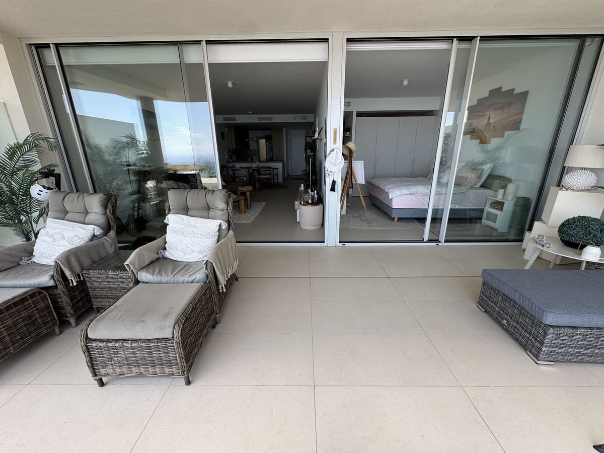 The apartment comprises an entrance hall, living-dining room, and open-plan kitchen with a breakfast bar that leads to a private covered terrace overlooking the lush garden and the sea beyond. The master bedroom has a spacious en-suite bathroom with a hydromassage shower, and there is a second bedroom and guest bathroom, also with a shower.