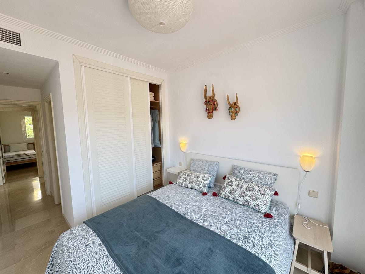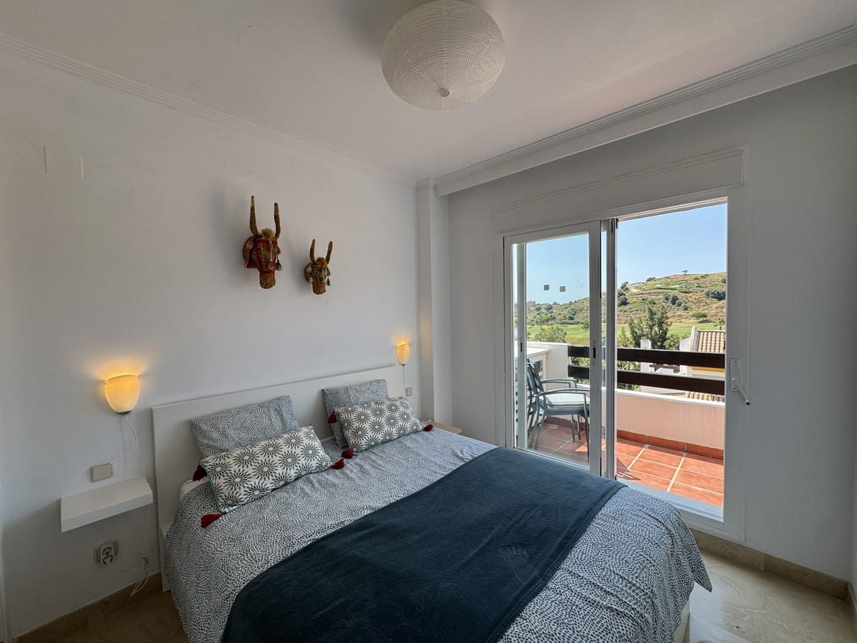 Inside, the property impresses with bright, modern living spaces and an open-plan layout. There are two bedrooms and two bathrooms, including a comfortable master suite with its bathroom en-suite. The guest bedroom enjoys its own private terrace facing the Mijas mountains.