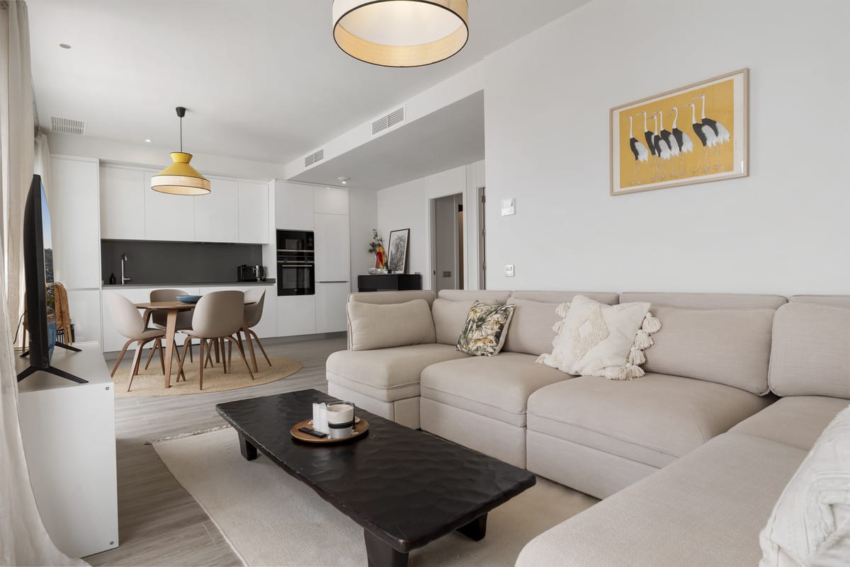 Located in the sought-after Le Mirage Phase III on the New Golden Mile, this stylish 2-bedroom, 2-bathroom corner penthouse offers a perfect combination of modern comfort and prime location. The bright open-plan living and dining area features floor-to-ceiling sliding glass doors that lead to a spacious terrace, filling the home with natural light and framing spectacular views of the sea, mountains, and evening sunsets. The fully fitted kitchen comes with high-quality Siemens appliances, and both bedrooms include fitted wardrobes, with the master benefiting from an en-suite bathroom.