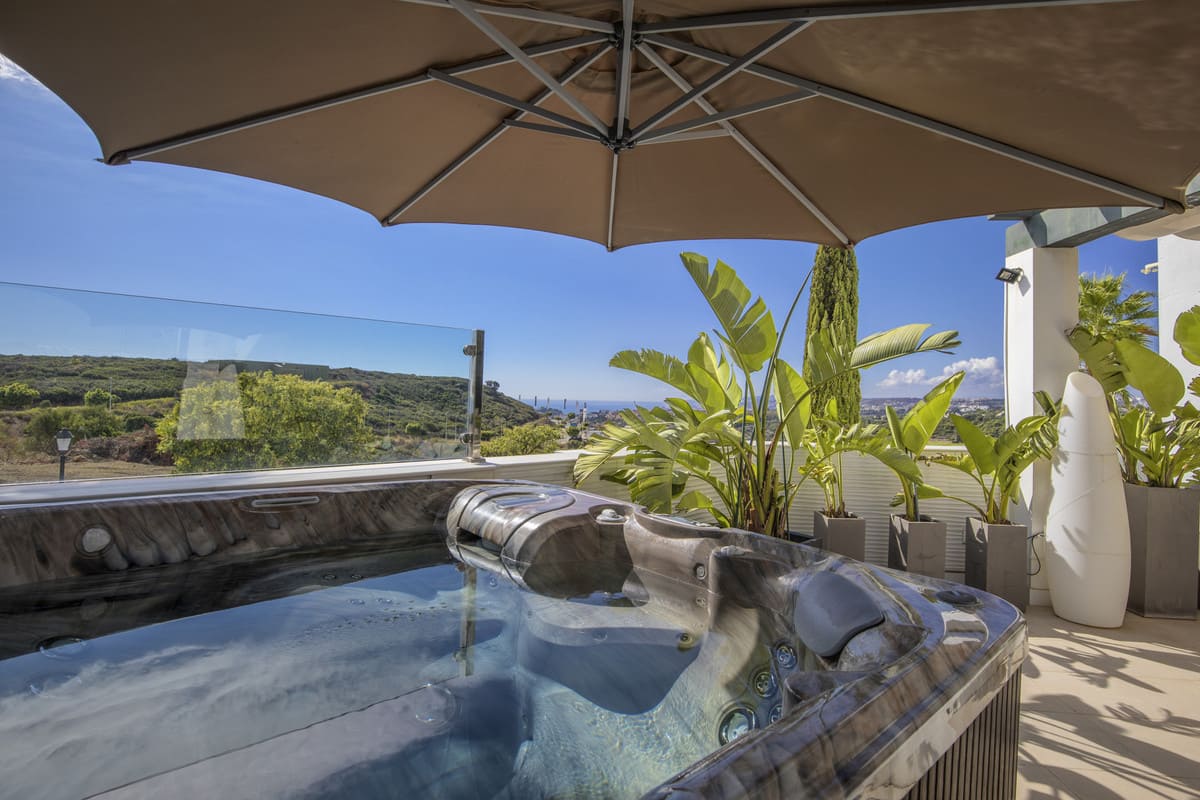 At the front, an enclosed outdoor living terrace with glass curtains serves as an elegant extension of the main living space—perfect for year-round enjoyment. Beyond, a further open terrace with a jacuzzi invites relaxation amid breathtaking panoramic views. At the rear, a peaceful garden terrace offers an intimate space to unwind. Additional features include air conditioning, ample wardrobe space, a dedicated office, private parking, a large storage room, and access to the resort’s communal pool, gardens, and gym.