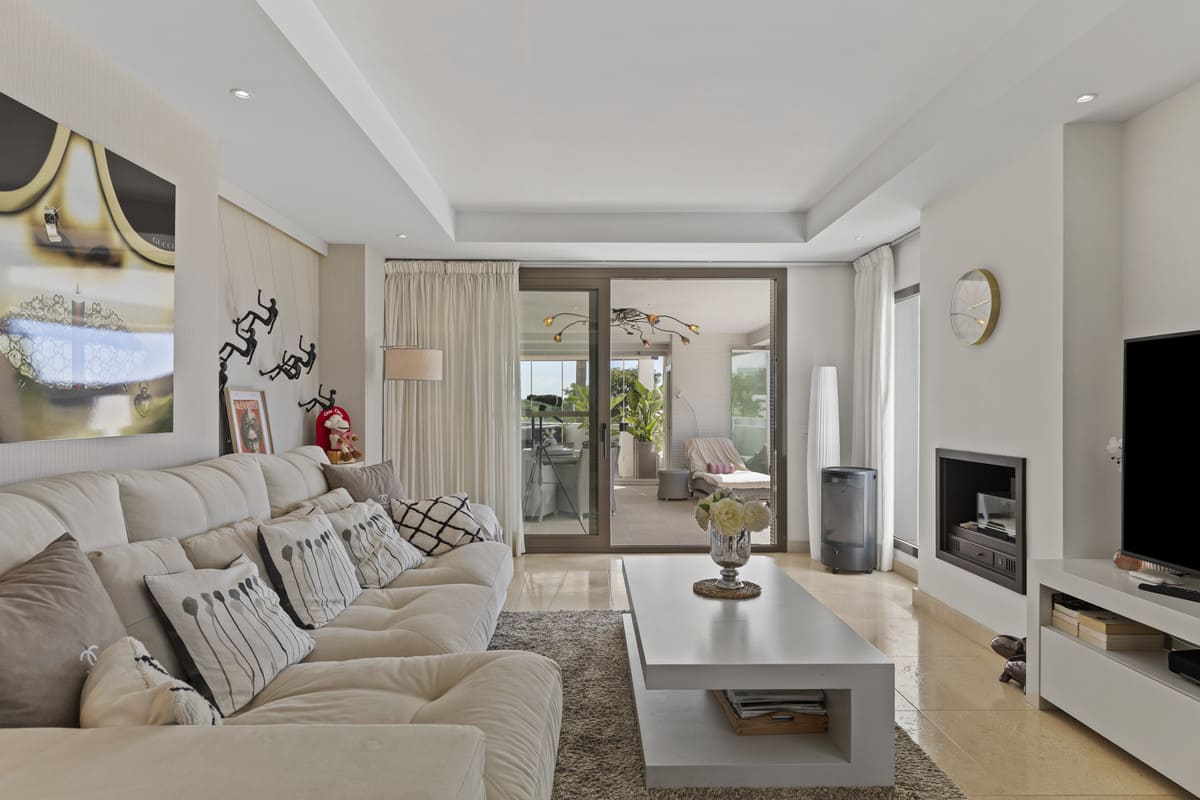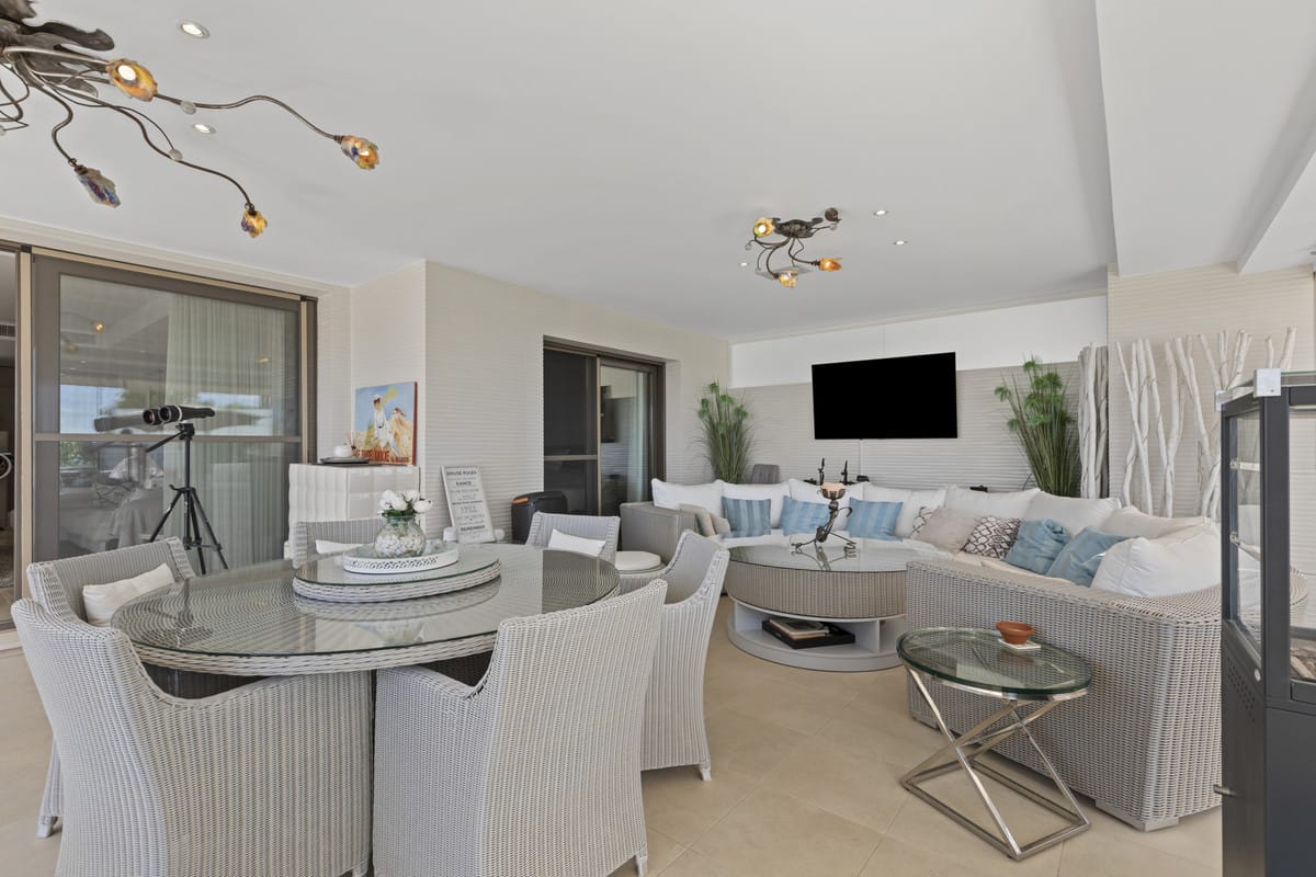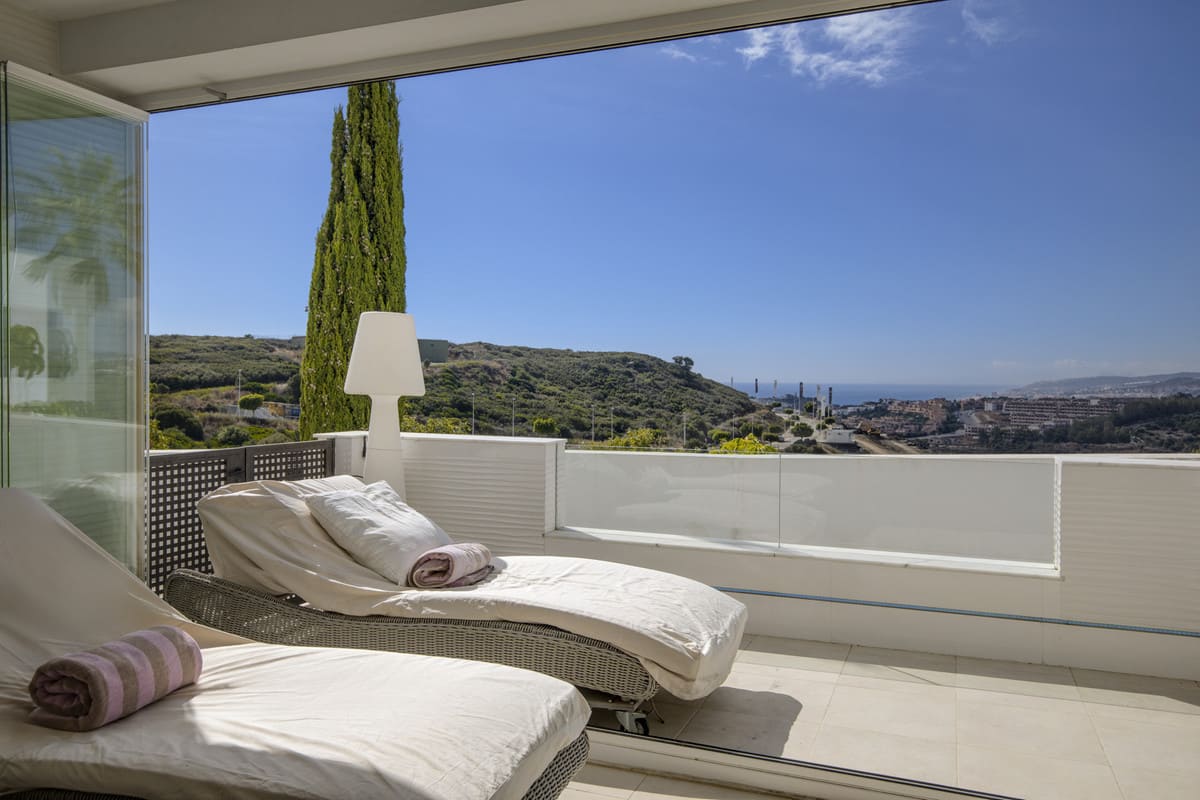 The open-plan, ultra-modern kitchen with a stylish breakfast bar flows effortlessly into the expansive living and dining area, where picture windows frame captivating sea, mountain, golf, and urban views. The south facing orientation ensures abundant sunlight throughout the day, highlighting the home’s marble flooring, double glazing, and gas fireplace that together evoke comfort and sophistication.