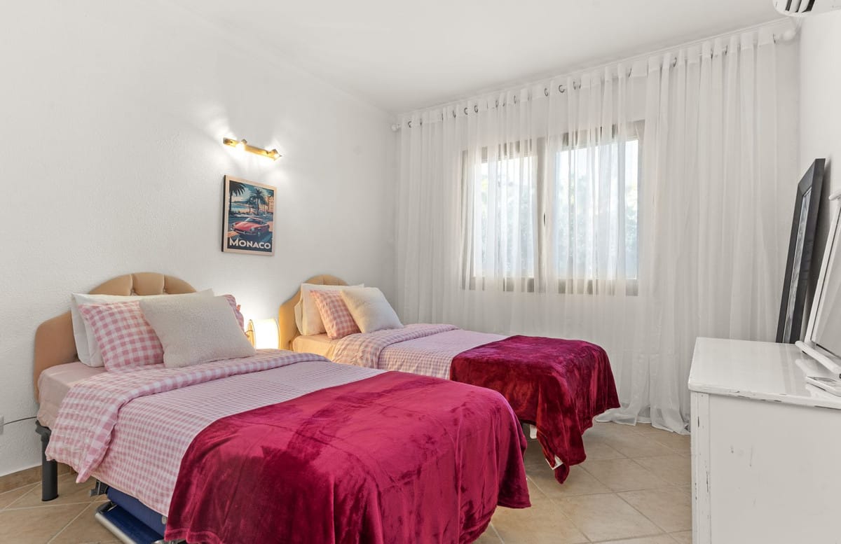 The double guest bedroom is accessed from a long private corridor and offers 2 single beds, wall to wall elegant white net curtains and double integrated sliding wood panelled wardrobes. Adjacent fully renovated spacious guest bathroom with contemporary tiling, marble top vanity unit and integrated ceiling spots.