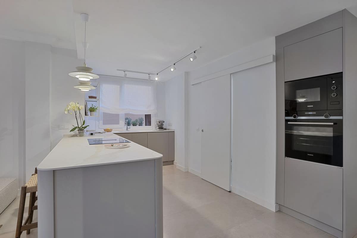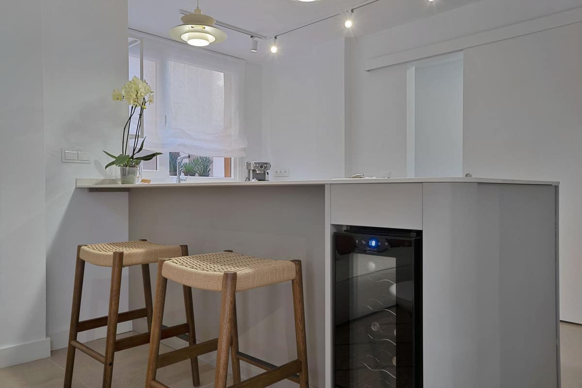 The spacious living room with dining room and open-plan kitchen is fully furnished and equipped with Siemens appliances, there is also a wine refrigerator.