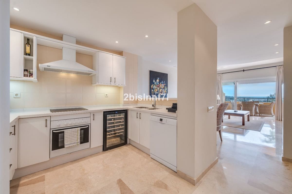 The apartment features a spacious and inviting living and dining area with large sliding doors that open onto a generous terrace offering open, green views. The modern open-plan kitchen is fully equipped and includes a breakfast bar and elegant countertops – ideal for social dinners and relaxing evenings at home. The property offers two comfortable bedrooms and two bathrooms, one of which is en suite with a bathtub and the other with a shower. Bright marble floors run throughout the apartment, and the bathrooms are stylishly finished.