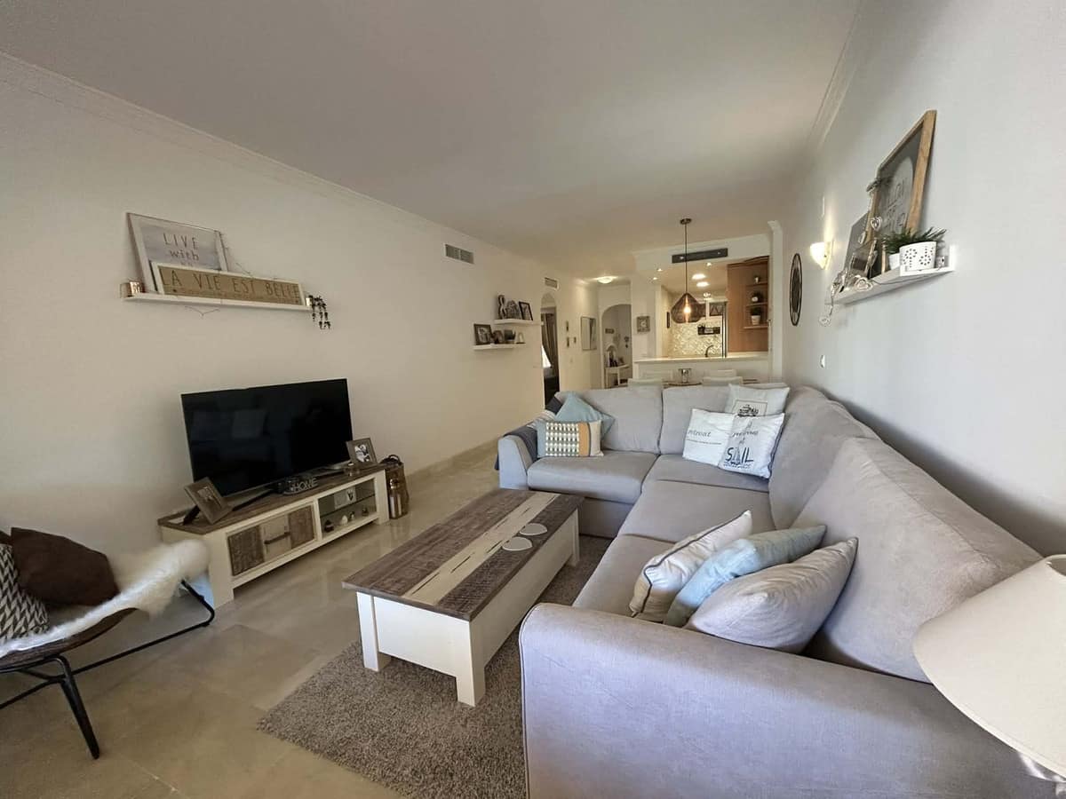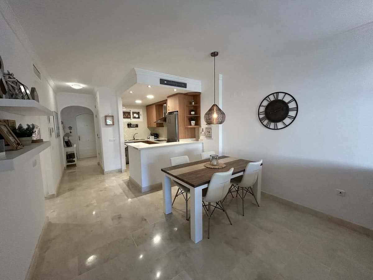 Elegant and bright west facing apartment situated in Santa Maria Village, a gated 24hour security community nested in Elviria, only minutes away from Marbella's nicest sandy beaches. This immaculate apartment combines comfort, style and convenience and features an ample open plan living & dining room with a modern fully fitted kitchen. From the living room and master bedroom you exit out onto the large covered terrace with views to the pool, communal gardens and surroundings. This is a quiet and well kept community with landscaped gardens, 4 large swimming pools, children's pools and is just a 5 minute drive from 2 commercial centers with shops, supermarkets, bars, restaurants and other amenities, making it the perfect blend of comfort and accessibility. The property also features A/C hot & cold, laundry room, a private dedicated parking space & storage room. The perfect holiday home or permanent residence for those seeking tranquility without sacrificing amenities and security.