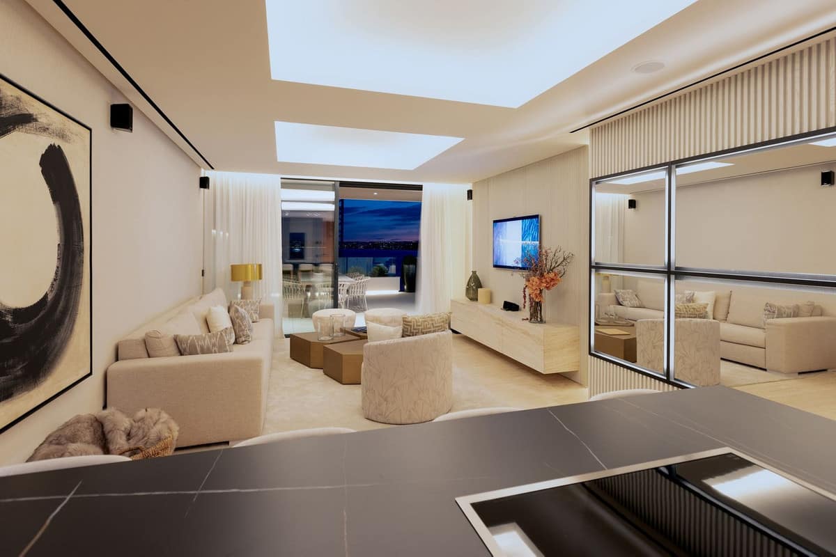 • Bright living room with access to covered terrace and panoramic sea views