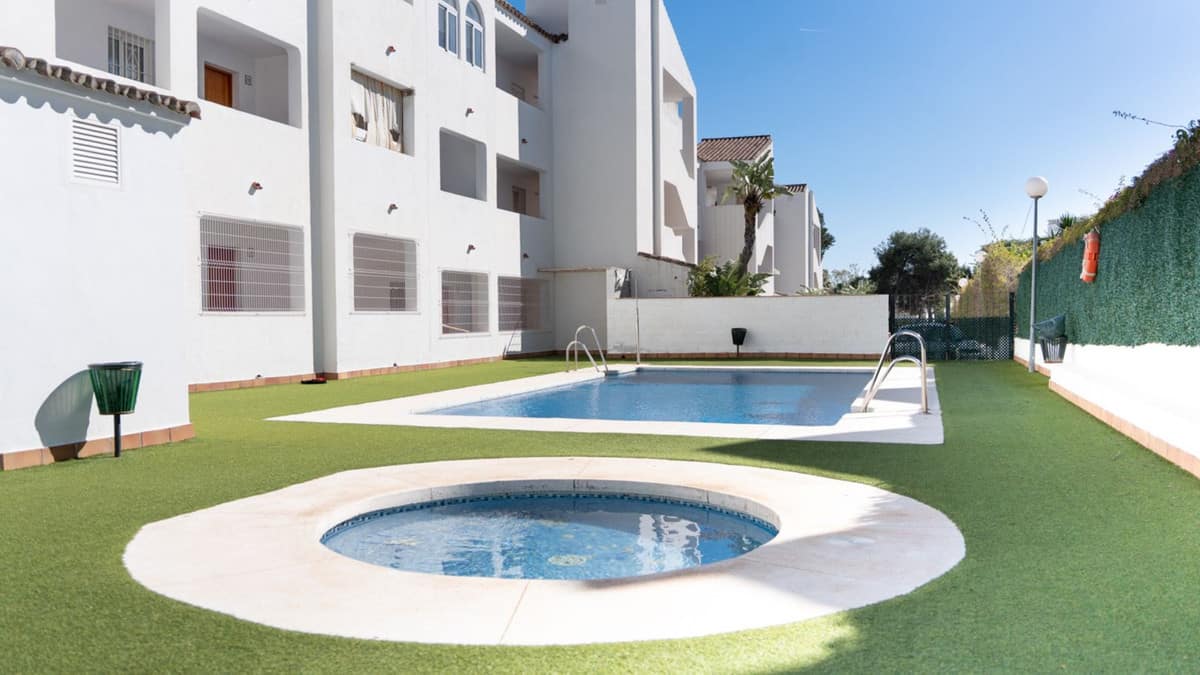 The apartment is in good condition and includes features that add long-term value, such as marble flooring, fitted wardrobes, good orientation, and excellent natural light. The terrace provides a comfortable outdoor area with space for a table and chairs, suitable for year-round enjoyment. The complex also offers a communal swimming pool and landscaped gardens, creating a pleasant and well-cared-for environment.