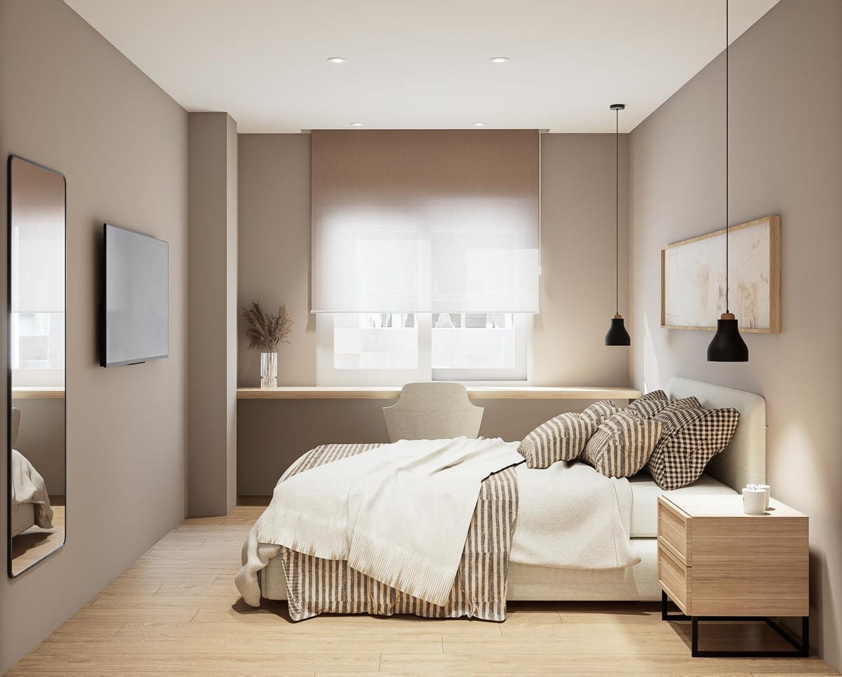 The apartment features two bedrooms, both with built-in wardrobes and modern finishes. The master bedroom has a large private bathroom with a spacious shower, while the second bathroom is also fully equipped and maintains the same contemporary design. Finishes include porcelain flooring in wet areas and double glazing on all windows, ensuring comfort and efficiency.