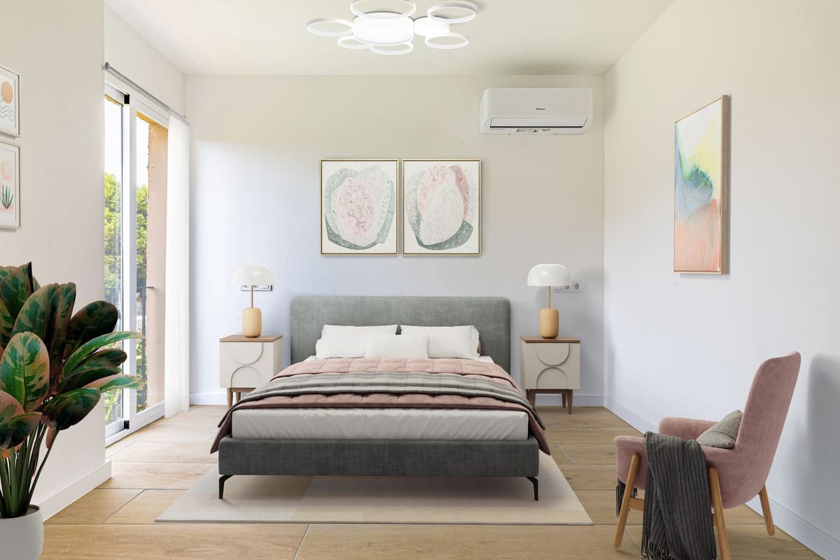 The home has a usable interior surface of 103.58 m², a main terrace of 35 m², and a private garden of 32.2 m². It includes two bedrooms and two bathrooms, one of them en-suite, as well as a 7 m² storage room and a private parking space. The property is equipped with aerothermal heating, underfloor heating, air conditioning, and domotic automated blinds, ensuring both comfort and modern convenience.