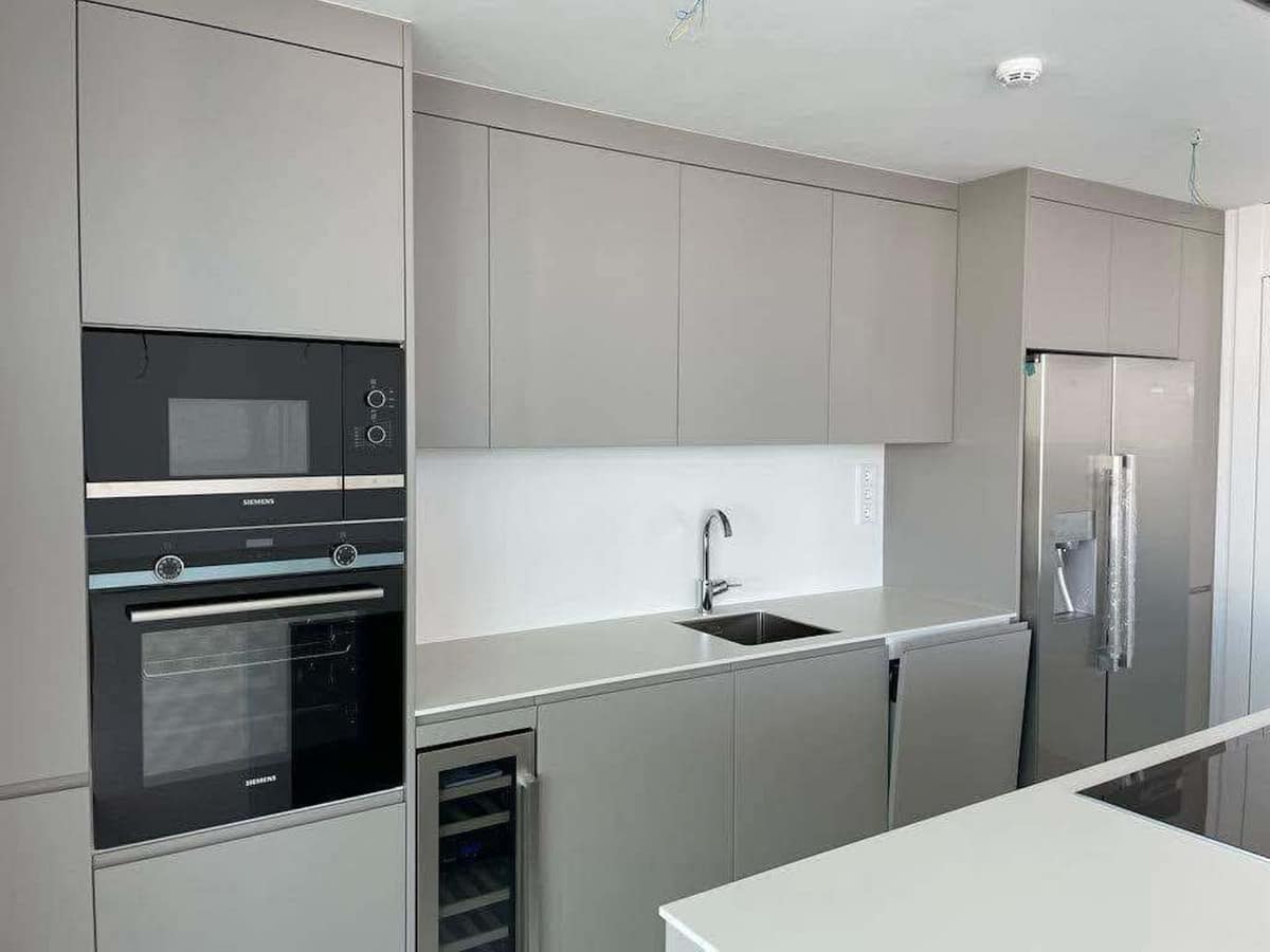 The open-plan kitchen is fully equipped and includes a central island, seamlessly connecting to the dining area and a generous living room. The layout is exceptionally functional, designed to make the most of space and natural light. Both the living room and master bedroom are equipped with floor-to-ceiling sliding glass doors that open up to the terrace, creating a smooth indoor-outdoor living experience.