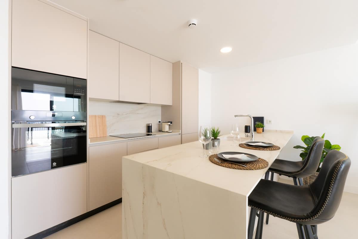 The apartment features two spacious bedrooms, one of which has an en-suite bathroom. The modern kitchen and living room have an open floor plan with direct access to the terrace. The master bedroom also has its own access to the terrace. The layout is bright and open, with high-quality finishes and plenty of natural light.