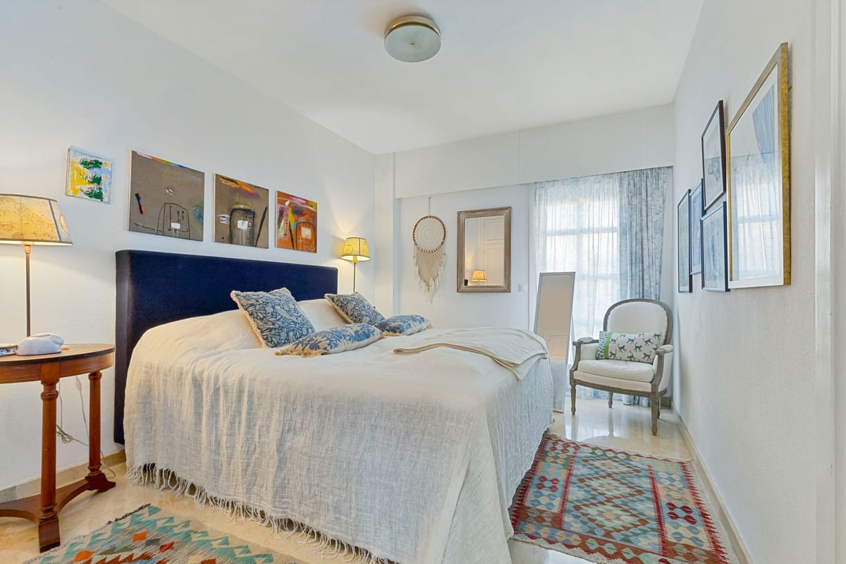 The bright and generous L-shaped living room offers ample space for both a comfortable seating area and a dining area, conveniently located next to the fully equipped kitchen. From the living room, you access a cozy south-facing terrace overlooking the pleasant communal garden – a perfect spot to enjoy the sun and relax. Residents of Tres Coronas benefit from excellent communal facilities, including a rooftop swimming pool and sauna, providing a true Mediterranean lifestyle. The location is unbeatable for convenient living. Train and bus stations are just 100 metres from the property, and the beach is approximately 400 metres away. A wide selection of restaurants, cafés, shops and services can be found within walking distance.