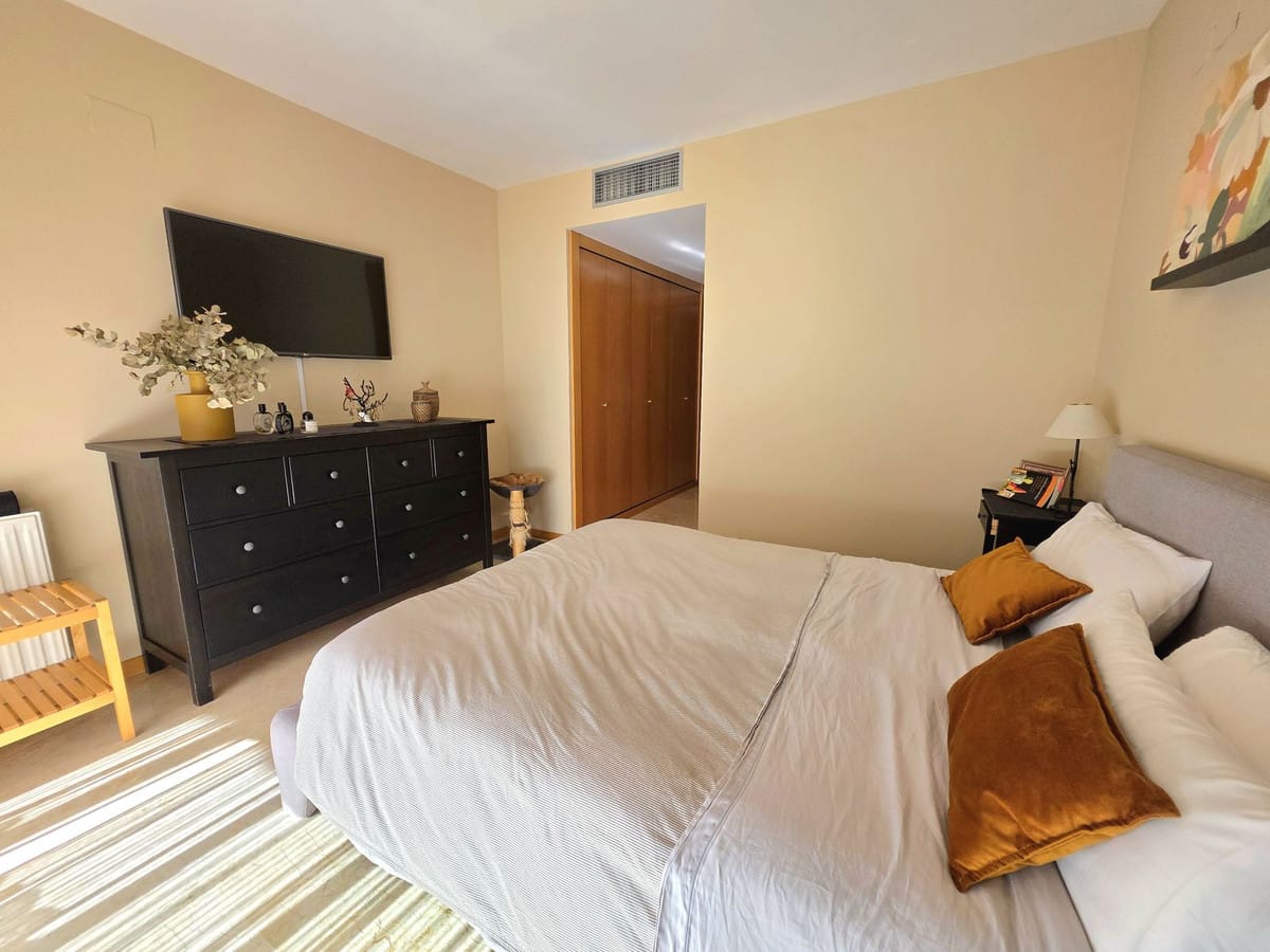 The property itself is spacious with plenty of natural light, thanks to its sunny south facing orientation. The bright living-dining room opens up onto the large terrace with views across the urbanisation, golf, gardens and pool. There are 2 spacious bedrooms and 2 full bathrooms both of which have been renovated. The master bedroom has a private en-suite bathroom, dressing area with plenty of wardrobe space and direct access to the terrace. The kitchen is sold fully equipped with high-end appliances and could be easily opened up if the new owner prefers an open plan kitchen.