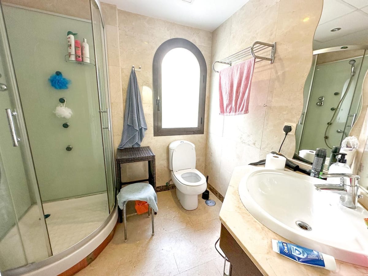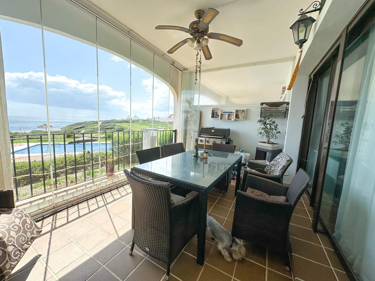 This bright and spacious property offers a large living area, a modern fully fitted kitchen with utility room, and an impressive glass-enclosed terrace with uninterrupted panoramic sea views, ideal for year-round use. South-east facing, the apartment enjoys excellent natural light throughout the day. It also includes two private underground parking spaces, a storage room, and access to beautifully maintained communal gardens and swimming pool. Located in a peaceful beachside setting, just a short walk from the beach and close to golf courses, marina, and local amenities.