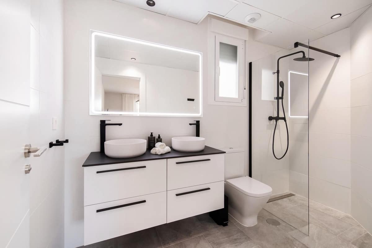 The apartment comprises two elegant bedrooms, with the principal bedroom benefiting from an en-suite bathroom and direct access to the terrace. The bathrooms are finished in a modern, minimalist style, featuring walk-in showers, rainfall fittings, contemporary sanitaryware, and subtle ambient lighting. A separate utility and laundry area further enhances the practicality of the home.