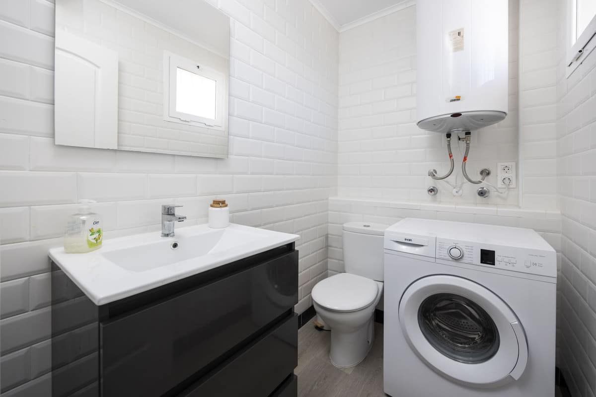 The kitchen is fully equipped with modern appliances, including an oven, coffee machine, and a dishwasher. The main bathroom has a bath-tub, while a separate guest toilet incorporates a washing machine, and a new compact electric water heater for added efficiency.