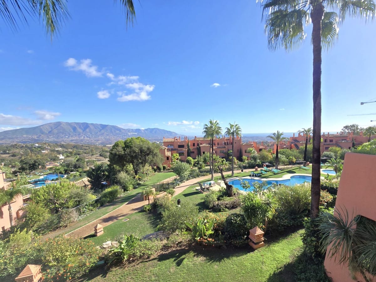 Spacious 2-bedroom first-floor apartment overlooking one of the swimming pools, with superb sea and mountain views, set within a luxury golf complex in the exclusive La Mairena area on the hills of Elviria—an area of outstanding natural beauty protected by UNESCO. The apartment offers very good-sized accommodation, which is ideal for family home, luxury holiday getaway or buy2let investment (holiday rental is permitted in the complex). The bright and spacious living room opens onto a large parrtly covered terrace, with sea views,and also views of the snow-capped Sierra Nevada mountains. The property also features a fully equipped semi open kitchen an adjacent utility room, and two large bedrooms with large fitted wardrobes. The master bedroom benefits from an en-suite luxury bathroom with a whirlpool bath and walk-in shower.The community includes extensive tropical gardens with 6 swimming pools (one of which is heated) and there is also tennis, paddle, gym, Spa and a private 9 hole golf course completely free for residents. Agreeable bar & restaurant in the on-site clubhouse. Private garage parking space and a storeroom. Brand new hot and cold air conditioning with airzone system , luxury cream marble floors and marble bathrooms, electric blinds, Mosquitos net.and “intelligent” house system… Must be seen!!!