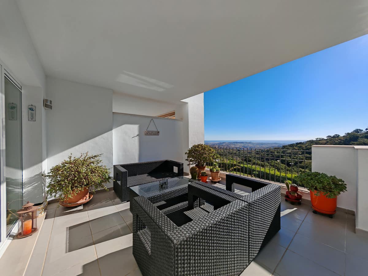 This stunning south facing apartment lies on the hills of Elviria, La Mairena and enjoys probably some of the most breath-taking views on the coast, with a panoramic vista that stretches across the Mediterranean to Gibraltar and Africa. As the best unit in this small, intimate complex, it benefits from no neighbours on the right and on the left, ensuring utmost privacy. The apartment boasts an open living and dining area, complete with a fireplace, that extends out to a sun-filled terrace with spectacular sea views stretching all the way to the coast of Morocco. Fully equipped spacious kitchen. There are 2 generous bedrooms and 2 bathrooms, including the very spacious master suite, with its beautiful bathroom, walk-in wardrobe and private balcony.