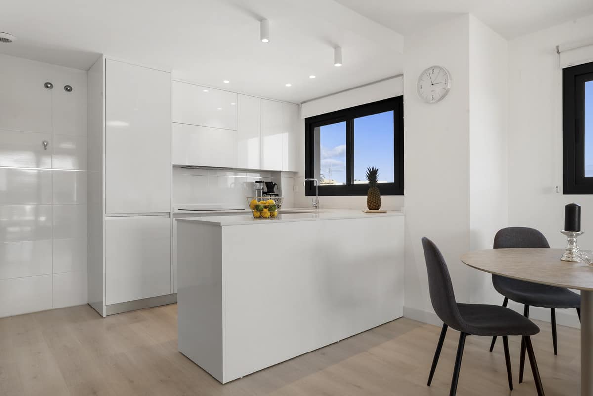 The heart of the apartment is the open-plan kitchen, flowing seamlessly into the bright living and dining area. Large sliding glass doors open onto the spacious south facing terrace, perfect for al fresco dining, relaxing, or enjoying the Mediterranean sunshine. The interiors are light-filled, airy, and designed for modern coastal living, combining neutral tones with high-quality finishes.