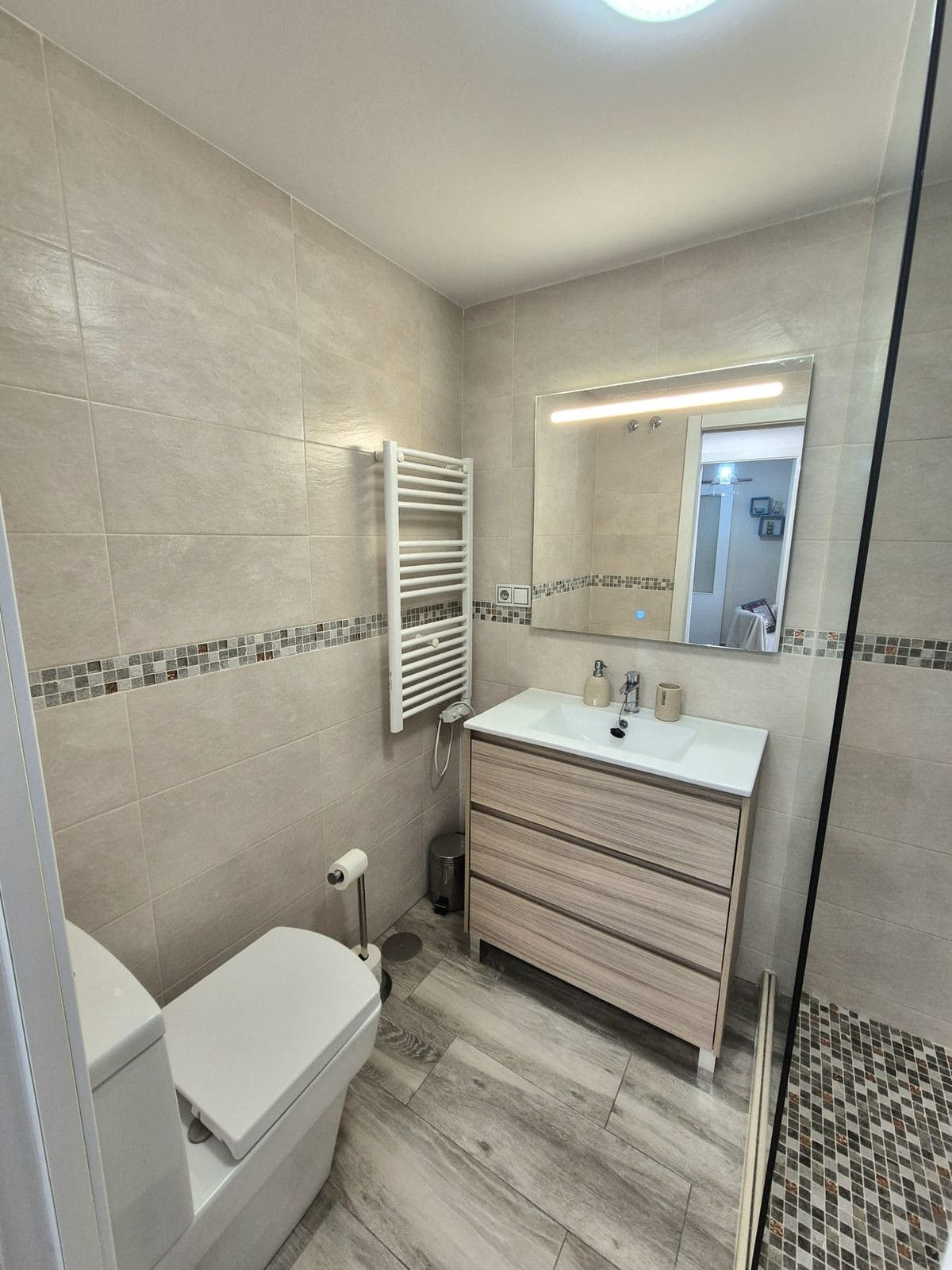 The entrance door to the building has been replaced with a modern glass entrance. It has mailboxes. Passing the elevator, you find the entrance to the parking garage. The apartment is very central, close to the A7 highway, schools, supermarkets, sports centers, medical centers, and local bus routes. Within walking distance to Fuengirola beach.