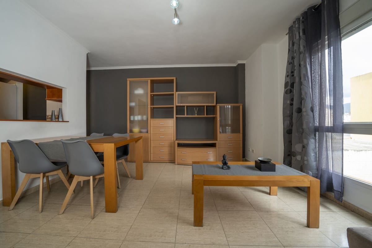 The master bedroom features fitted wardrobes and a private en-suite bathroom, while the second bedroom shares access to a fully equipped second bathroom. Both bedrooms include direct access to the balcony. The fully equipped kitchen seamlessly blends with the open-plan dining and living areas, offering a bright and social living experience. For added everyday convenience, the property also offers a separate storage area equipped with a washing machine.