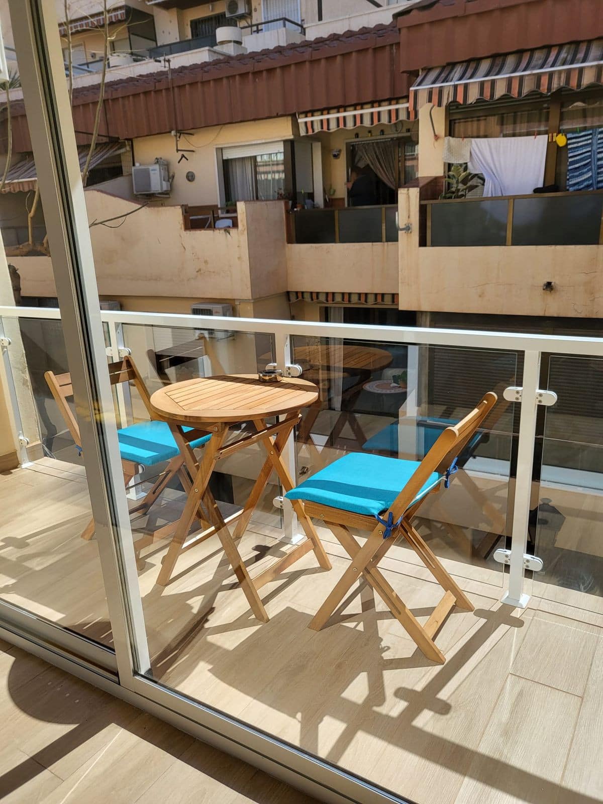The property features a master bedroom with a built-in wardrobe, a junior bedroom, and a private patio. The walls have a smooth finish, the floors are marble, and the windows are double-glazed. It is located on the first floor and has elevator access.