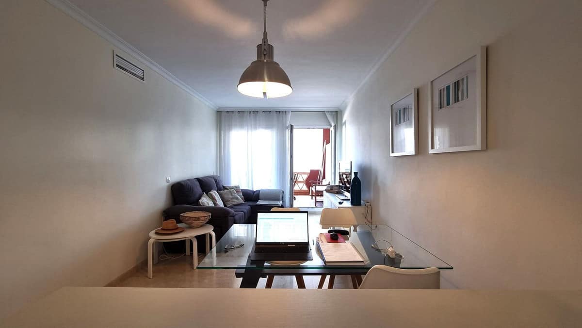 This spacious apartment features two bedrooms, two bathrooms, fully fitted kitchen and a living room leading onto its private terrace with glass curtains from where you can enjoy its spectacular sea views.