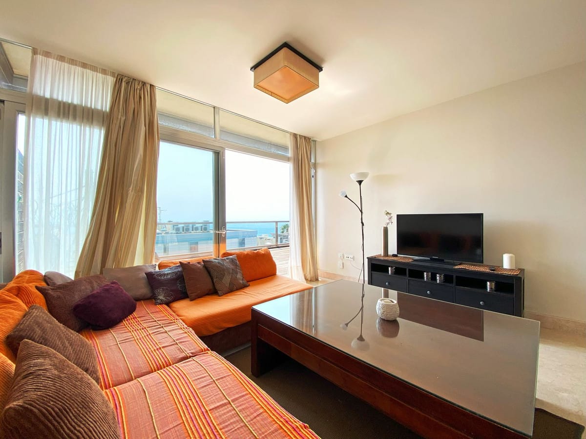 The apartment spans a total built area of 81m², with 62m² dedicated to interior living space. It features two spacious bedrooms and two modern bathrooms, all presented in excellent condition. The interior is fully furnished and benefits from air conditioning, double glazing, and a fully fitted kitchen, providing a comfortable and practical living environment. The covered terrace offers pleasant garden views, ideal for enjoying the mild Mediterranean climate.