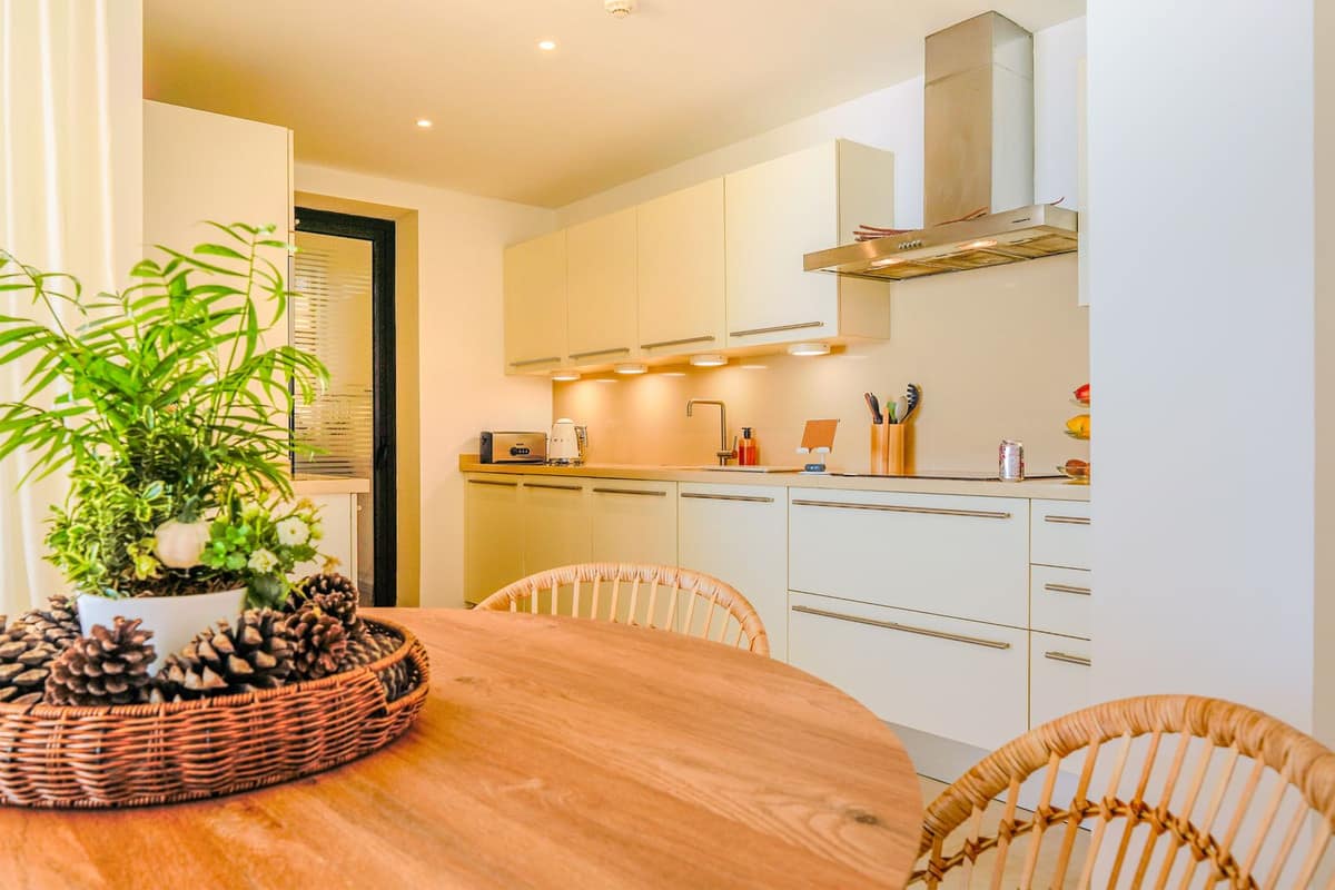 The open-plan living and dining area connects seamlessly with a fully equipped kitchen fitted with high-quality Siemens and Bosch appliances. A separate utility room with washer and dryer adds practicality. The property also features hot and cold air conditioning throughout, underfloor heating in the bathrooms, and excellent natural ventilation thanks to its elevated position.