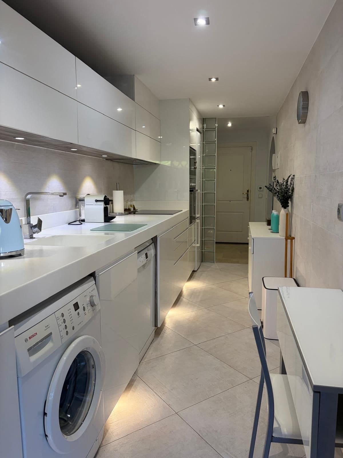 The apartment features a cosy entrance hall leading to a modern, fully fitted kitchen with top-of-the-range appliances (Bosch and Smeg). The spacious and bright living-dining room provides an ideal space for relaxation and socialising.