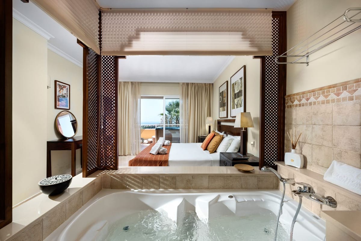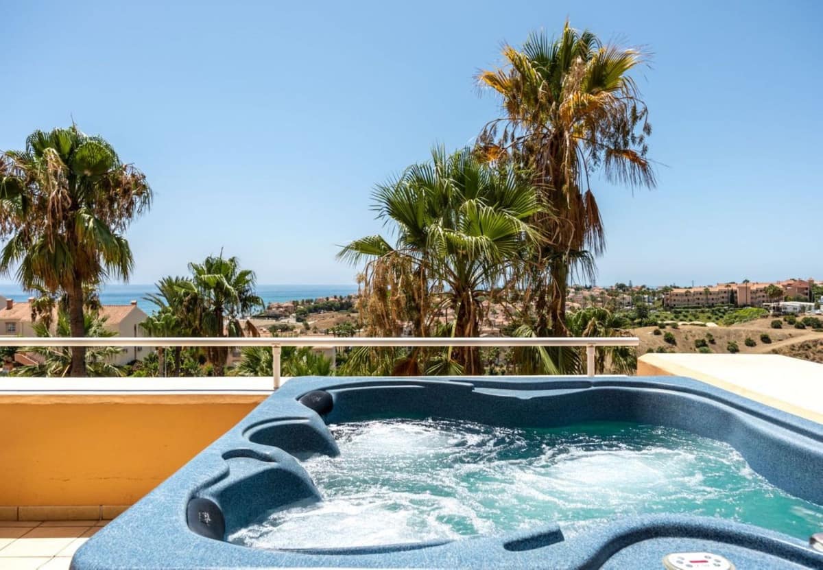 There are two bedrooms, both with fitted wardrobes and en-suite bathrooms. The master en-suite has a bath, and the guest suite has a walk-in shower. Patio doors lead out from the lounge and master bedroom onto the private terrace with a Jacuzzi hot tub with fantastic panoramic sea and mountain views. The kitchen is set of from the living area which is modern and stylish, with fully integrated units.