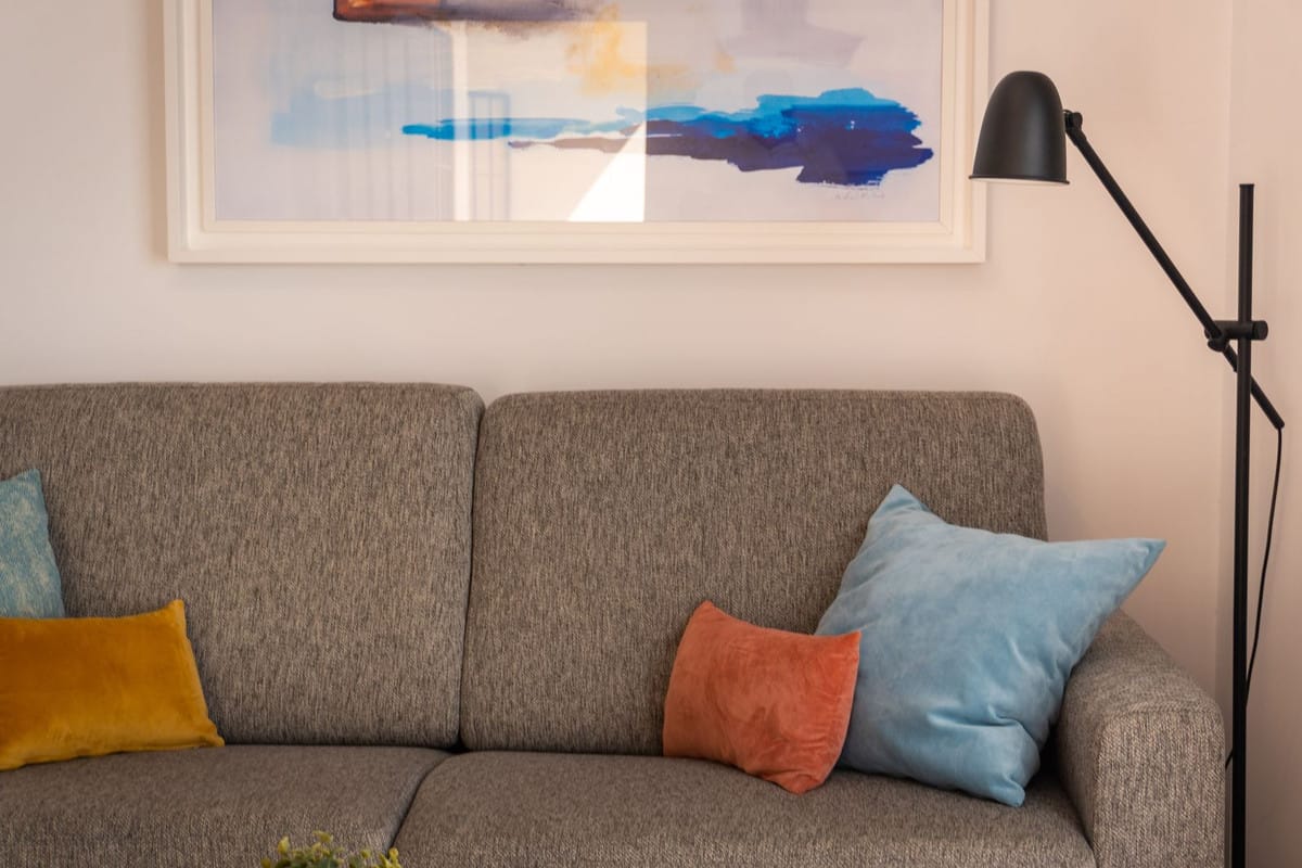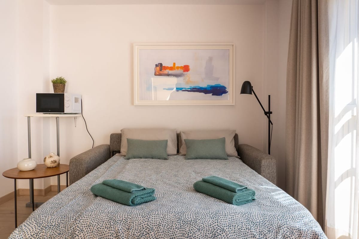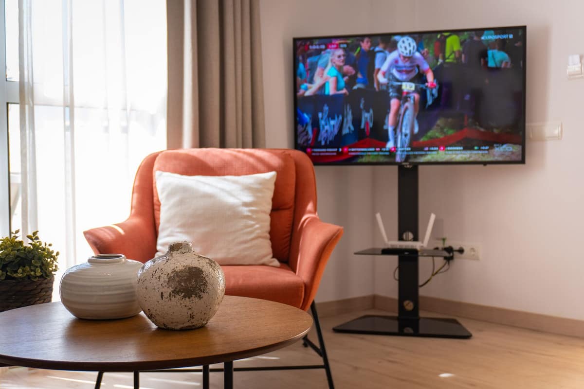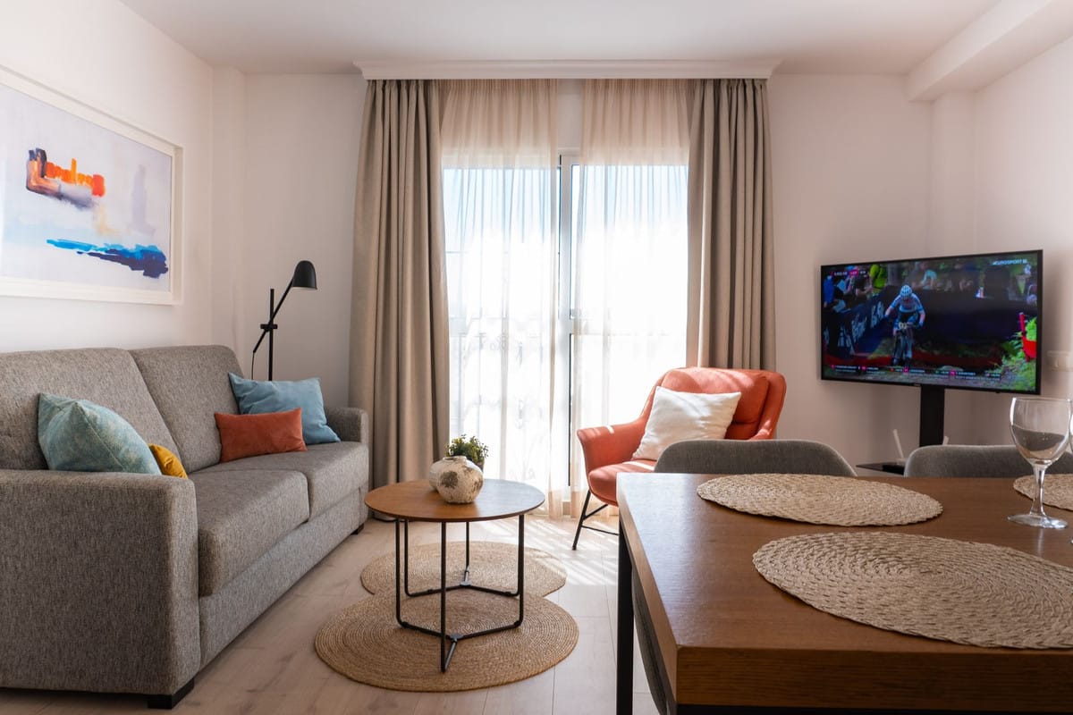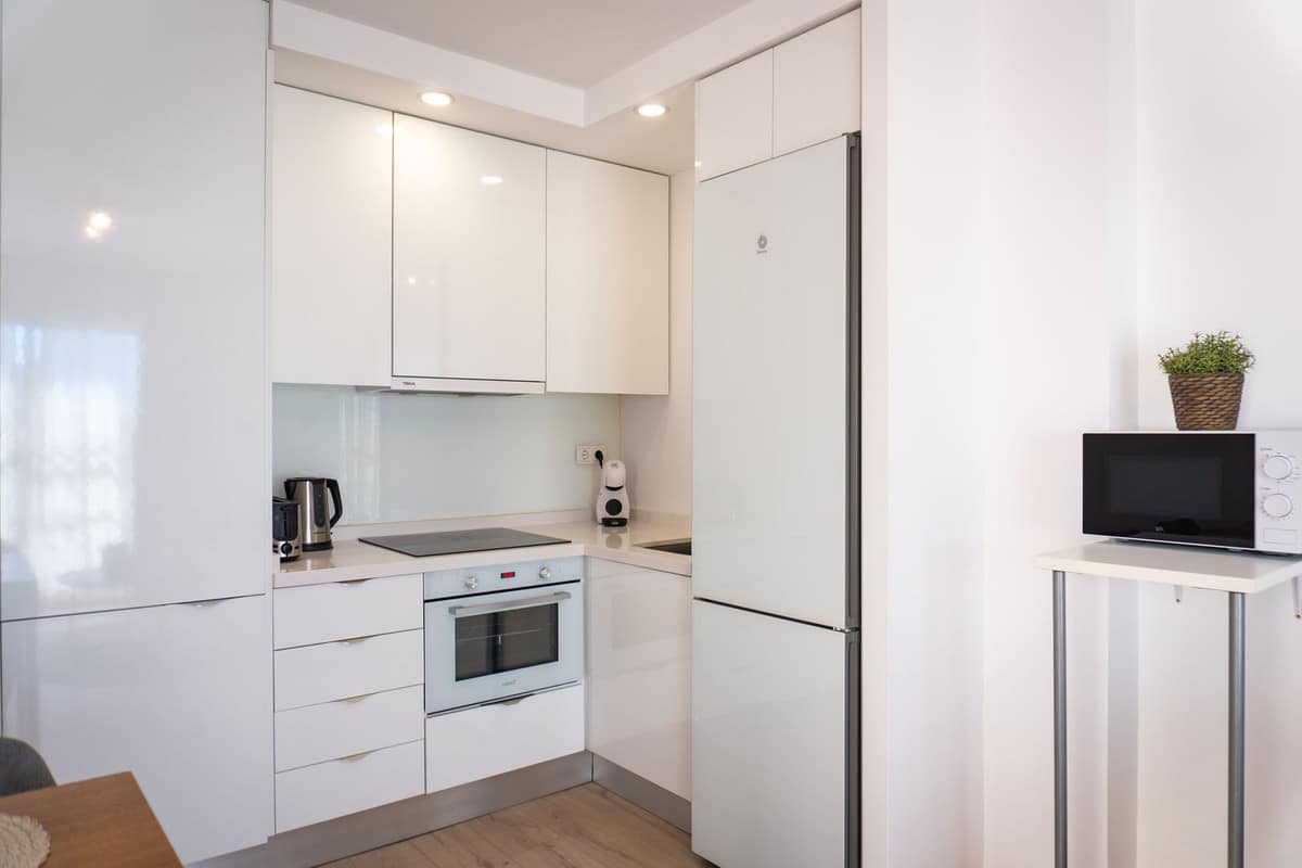 Fully equipped kitchen and bright living room with direct access to the terrace.
