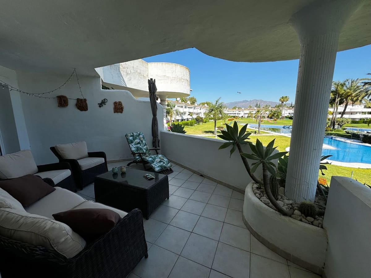 STUNNING ULTRA LUXURY/MODERN APARTMENT in front line Mijas Golf location. Refurbished to the very highest of standards. The property consists of a spacious lounge/dining room, modern fully fitted kitchen, master bedroom with en-suite bathroom, another double bedroom with walk in wardrobe (formerly second bathroom, but with all plumbing still in place to be made into a bathroom again easily), a small southwest terrace overlooking the immaculately kept communal gardens and swimming pools and a large covered north east terrace overlooking the golf course and mountains.