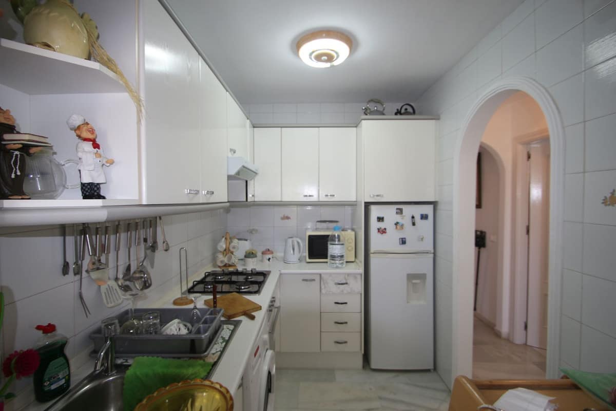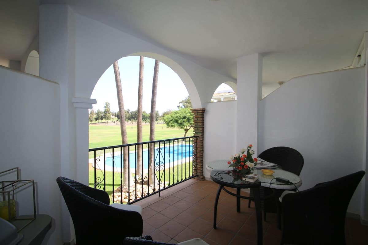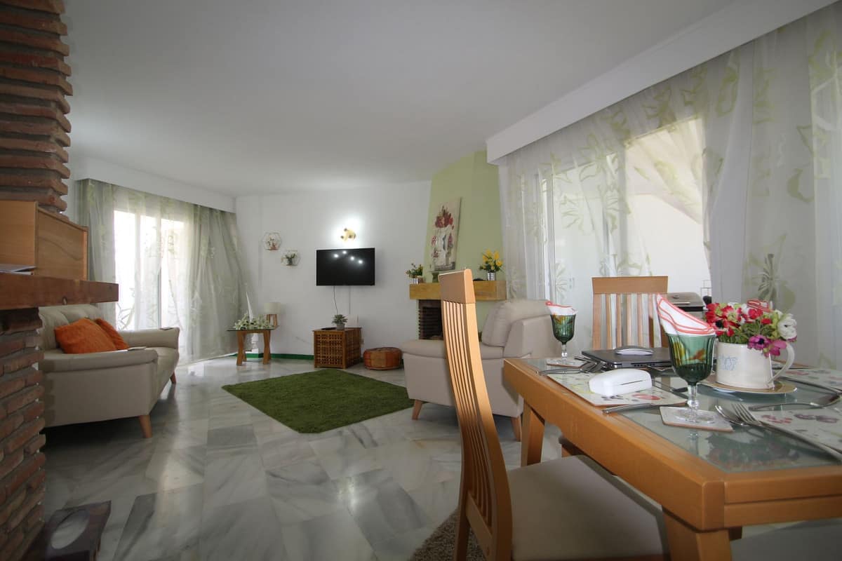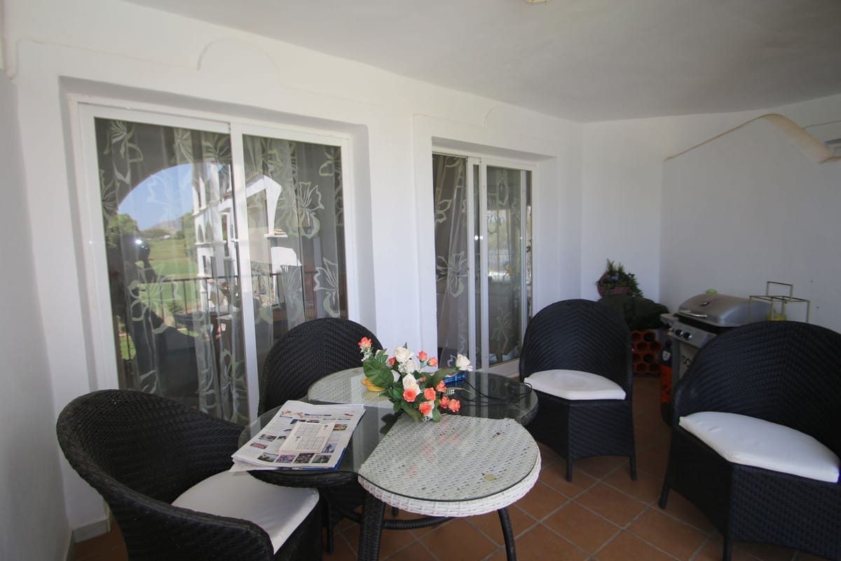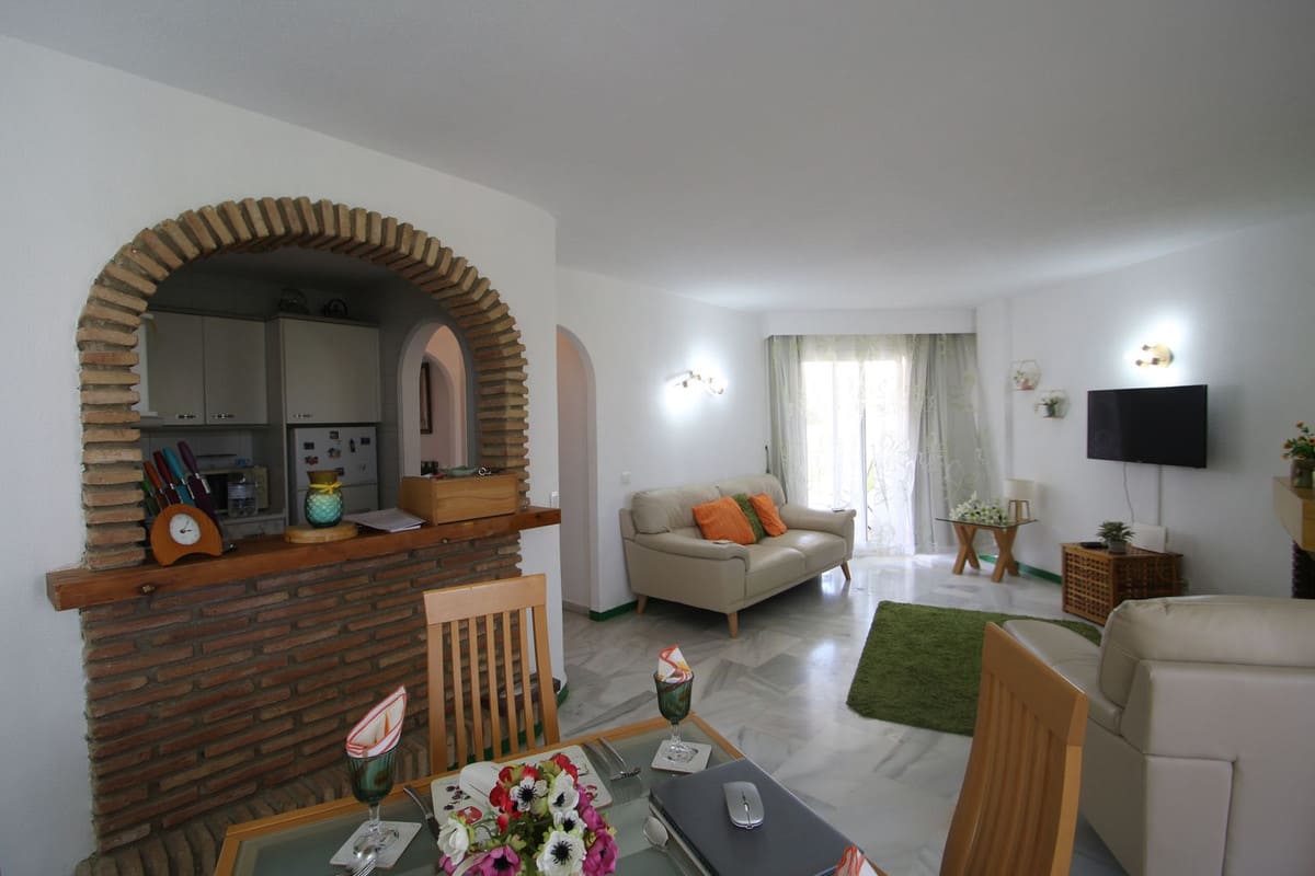 The interior has been thoughtfully upgraded throughout, featuring a fully fitted contemporary kitchen, quality appliances, and stylish cabinetry that blends seamlessly with the warm, inviting ambiance of the home. Tile flooring flows through each room, enhancing the sense of space and brightness. The living and dining area opens directly onto a generous private terrace, perfectly positioned to enjoy peaceful mornings and golden-hour evenings while overlooking the manicured greens of Mijas Golf.