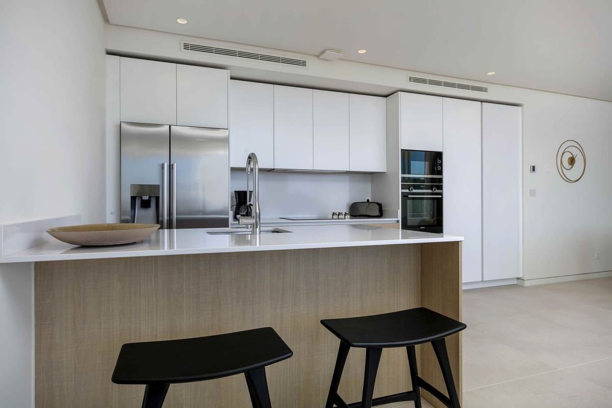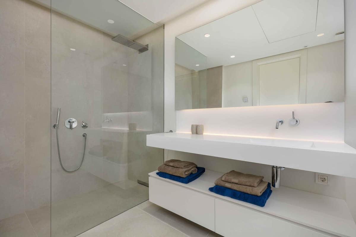 The apartment features a beautifully appointed master bedroom with an elegant en-suite bathroom, while the second bedroom is served by a separate bathroom conveniently located opposite. Both bathrooms are finished to a high standard and feature underfloor heating and luxurious walk-in showers, ensuring year-round comfort and a refined spa-like experience.