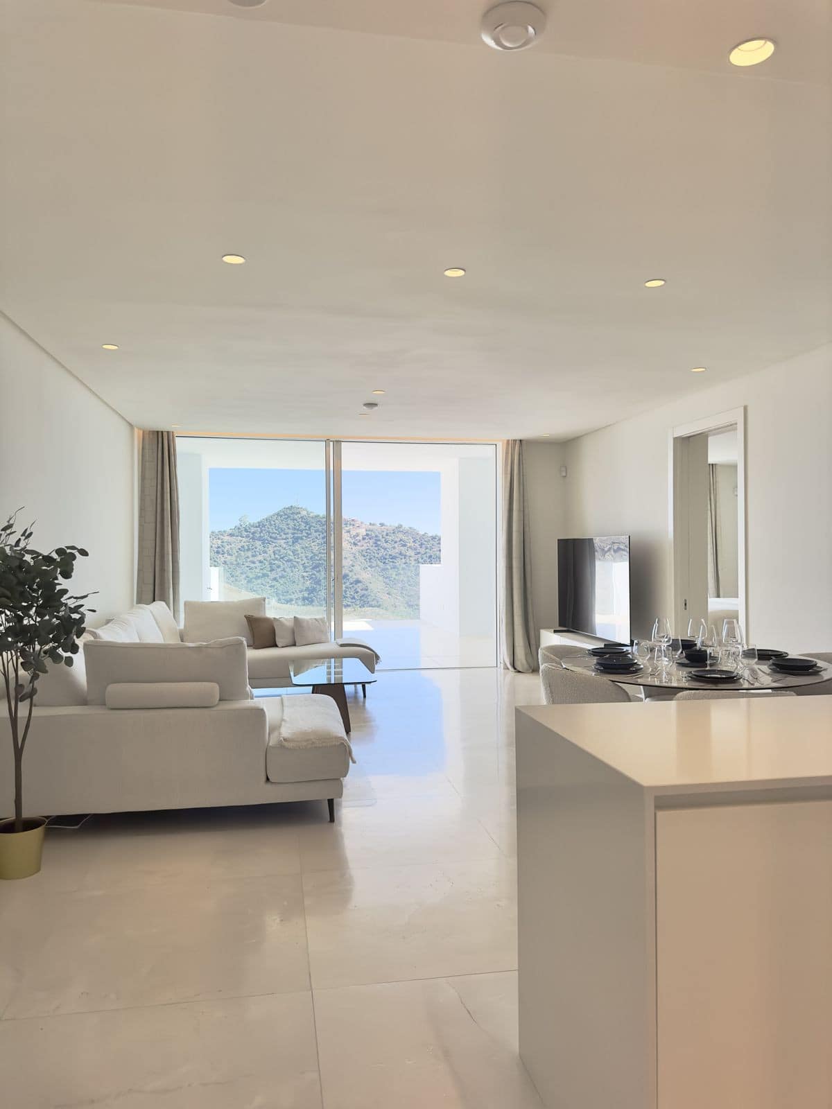 This elegant 2-bedroom first floor apartment for sale is located in the exclusive Granados development, set on the highest plot within the gated community of Palo Alto, Ojén, and enjoys beautiful panoramic sea views over Marbella and the Mediterranean.