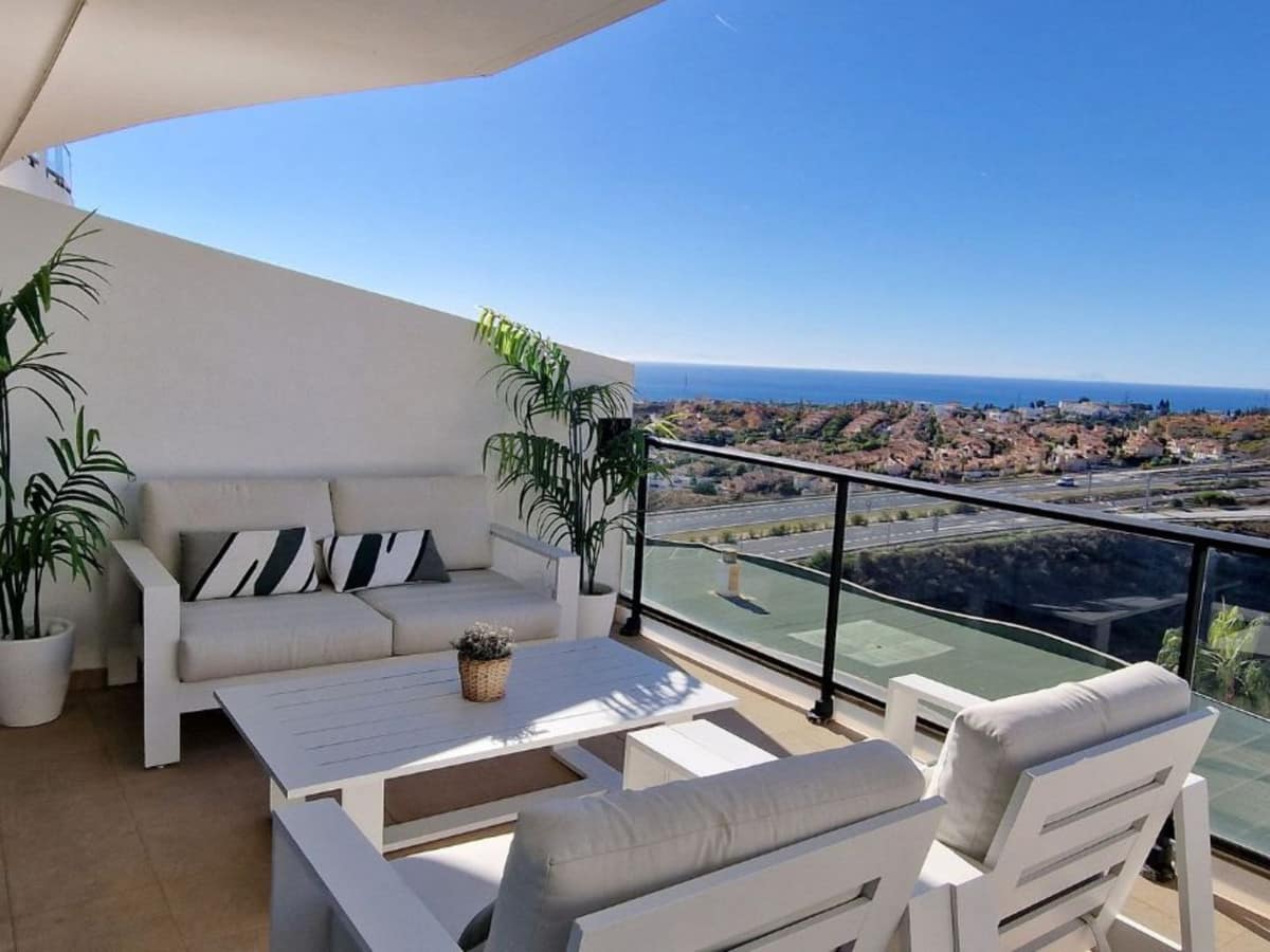 This exclusive penthouse boasts a prime location, just 5-10 minutes from several golf courses, schools, and tennis courts, within a popular and well-maintained residential complex. Facing south, it offers abundant natural light throughout the day and spectacular panoramic views of the sea, mountains, and surrounding countryside. The community features two swimming pools, a paddle tennis court, extensive communal gardens, 24-hour security, and excellent road access.